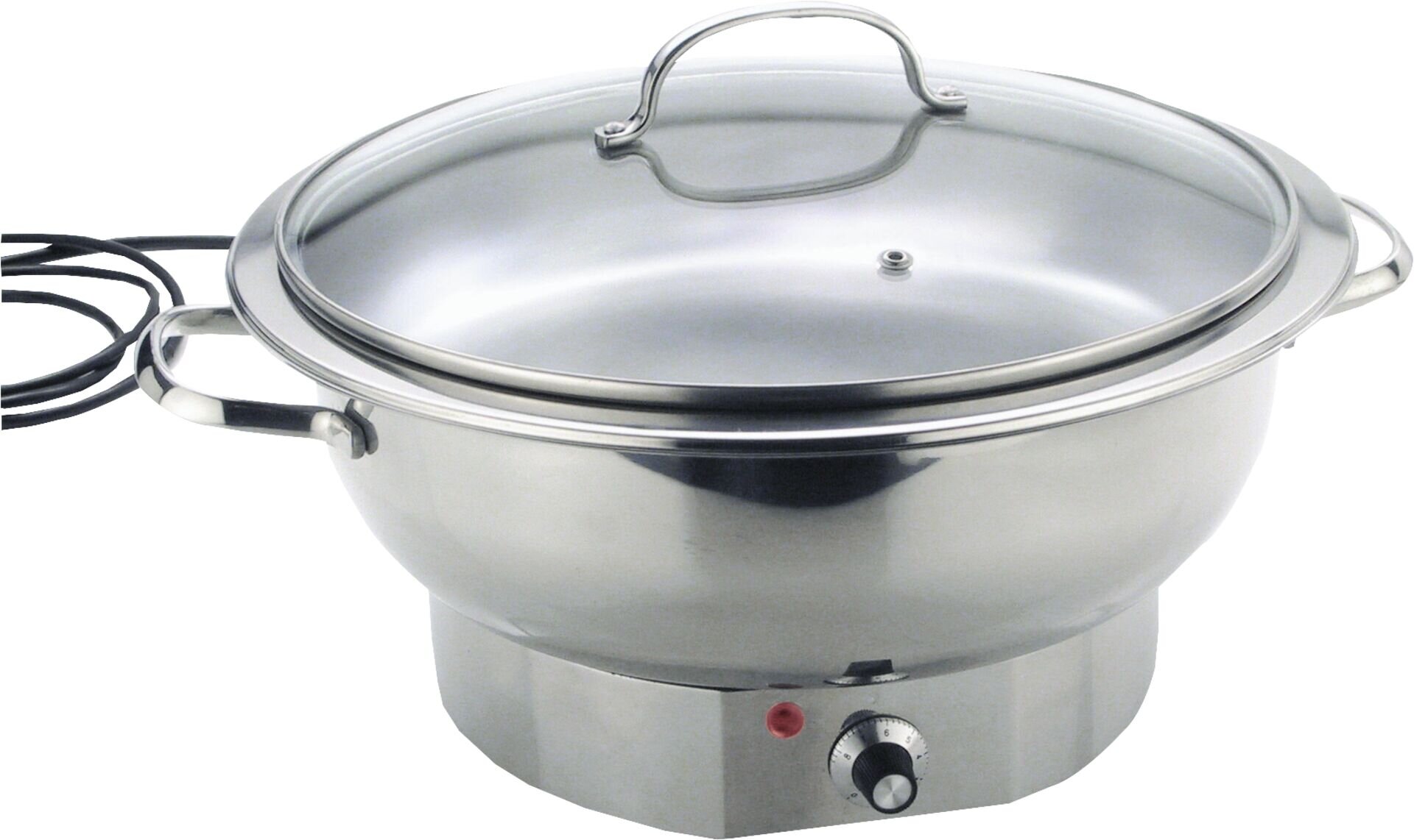 ØxH in cm: 30,0x16,0 Anschlusswert: 230V/420W/50-60Hz WEEE-Reg. Nr. WE 61118672 Edelstahl 18/10, rund, mit Glasdeckel, elektrisches Thermostat mit Überhitzungsschutz. Mit Speiseeinsatz (3,8 Liter).