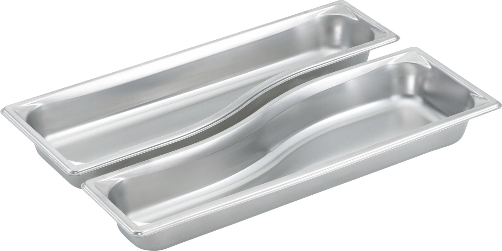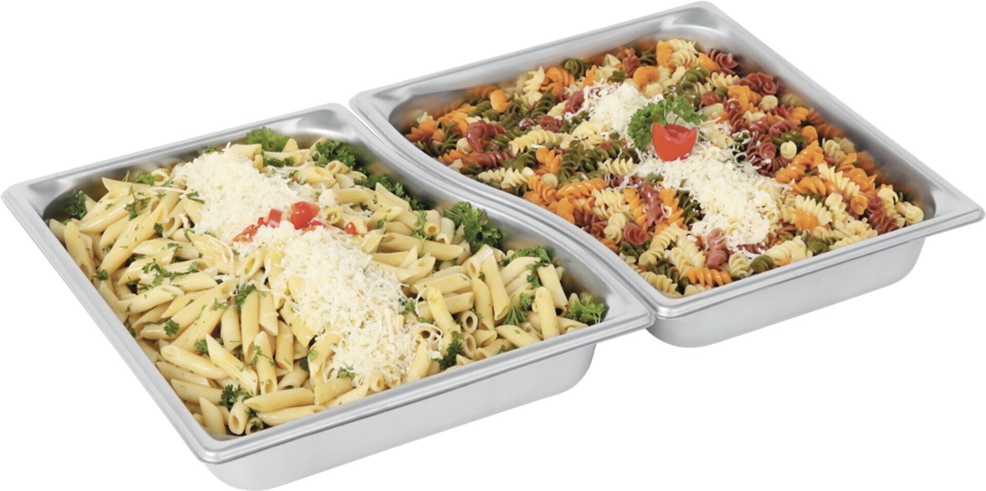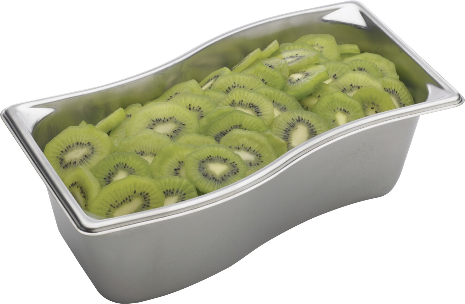 2x 1/3 GN außen + 1x 1/3 GN innen kombiniert Behälter in Wellenform. CNS Serie 300, Materialstärke 0,64 mm. Verstärkte Ränder und Ecken sorgen für mehr Stabilität und reduzieren den Temperaturverlust. GN: 2/4 Tiefe in mm: 89 Inhalt in L: 6,0 2/4 GN
