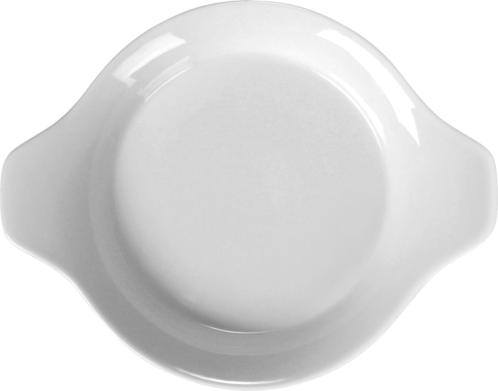 Porzellan, weiß. Planer Boden. Feuerfest bis 300°C. Spülmaschinengeeignet. Mikrowellenfest.