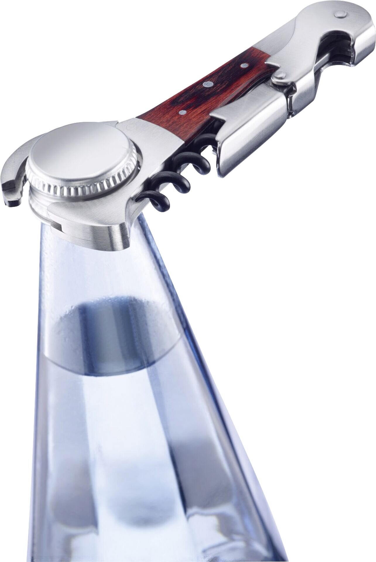 L in cm: 11,6 Aus hochwertigem Edelstahl mit Holzinlay, mit gezackter Klinge zum Kapselschneiden, der 2-Stufen Hebel erleichtert das Herausziehen des Korkens, mit Kapselheber für Kronkorken, beschichteter Wendel mit Seele, mit Zangenelement zum Öffnen von festsitzenden Schraubverschlüssen, nicht spülmaschinengeeignet.
