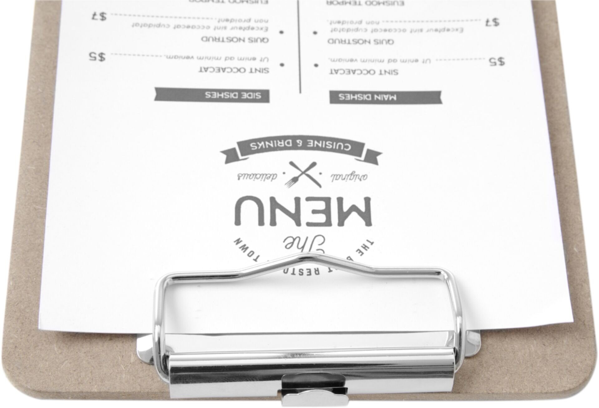 Strapazierfähige MDF-Platte mit Metall-Klemmmechanismus. Abgerundete Ecken.