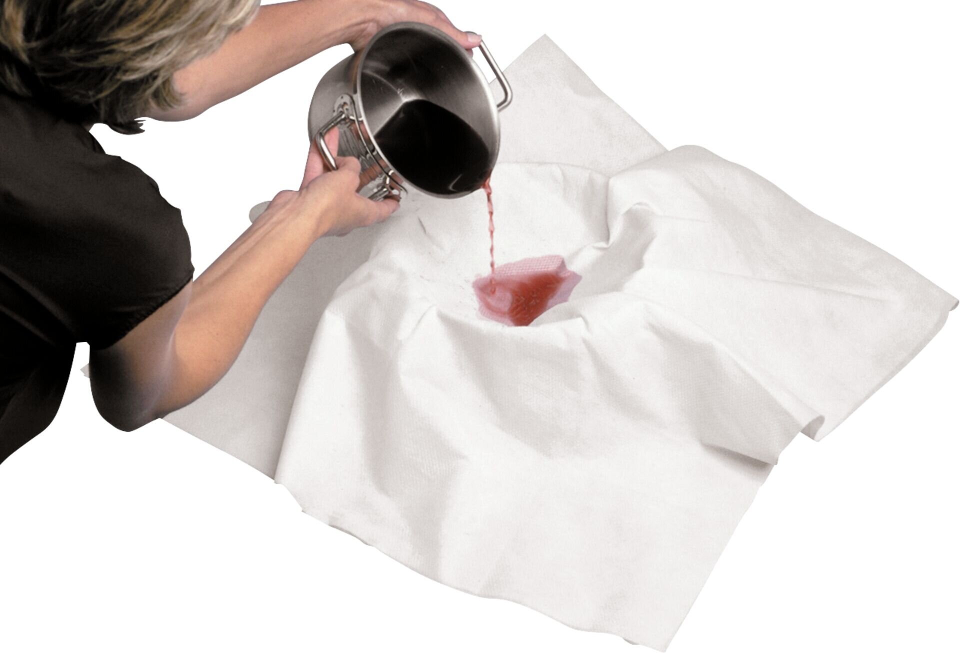 LxB in cm: 75x75 Spezial-Vliesstoff aus Polyamid, Einweg, weiß. Extrem reißfest und dehnbar, individuell zuschneidbar und hitzebeständig. Auch für heiße Speisen geeignet. Im 25er Pack.