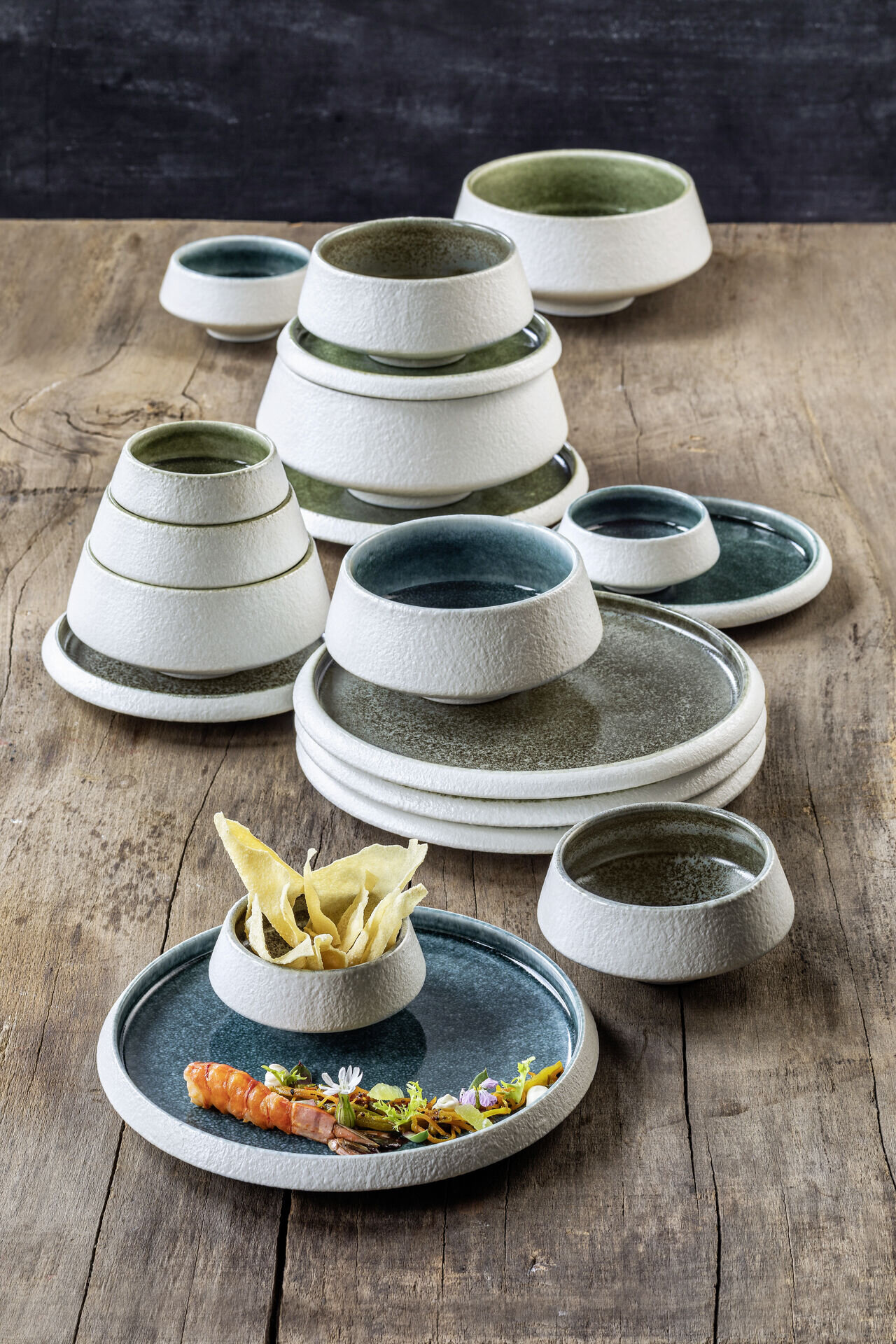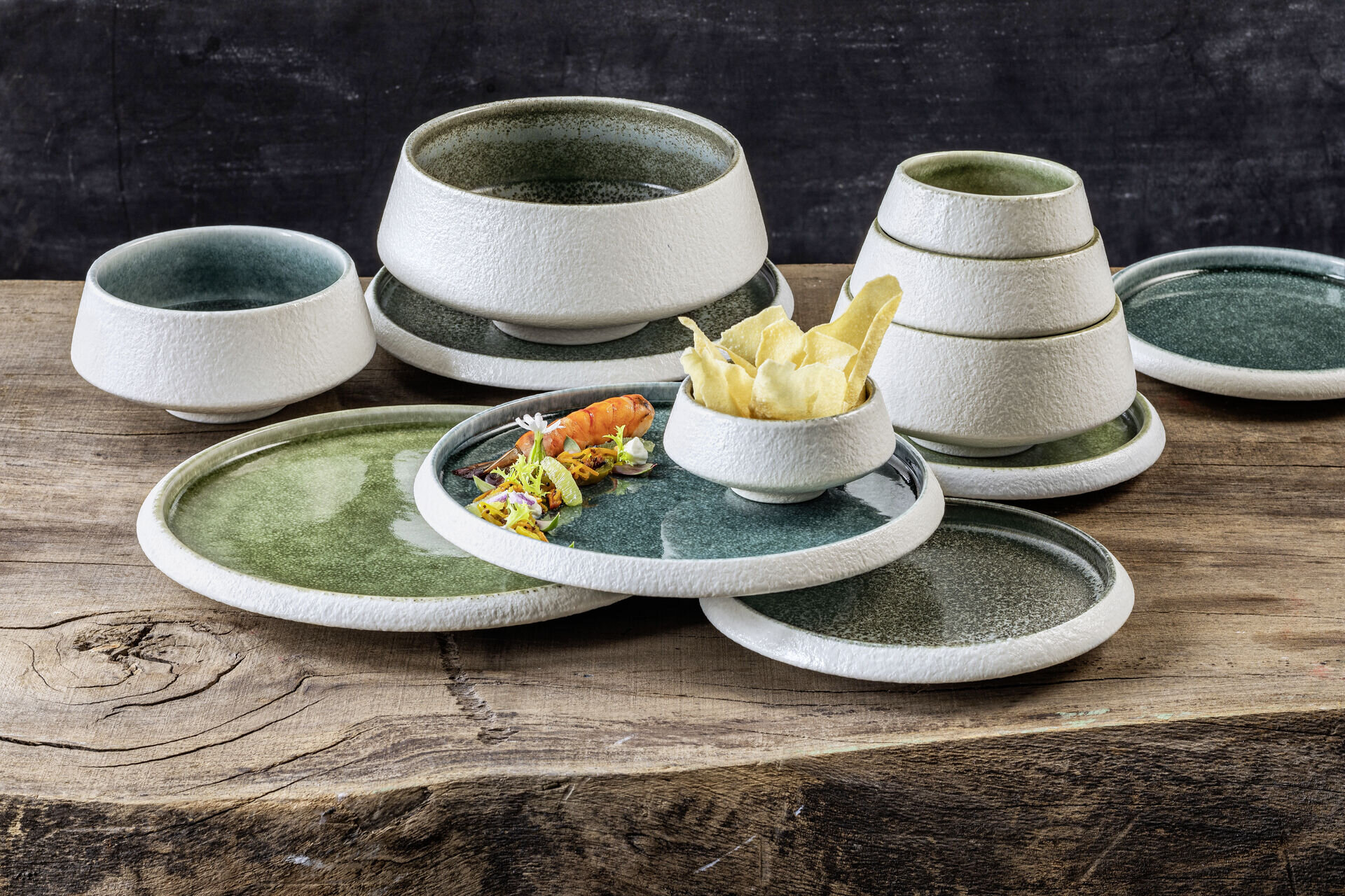 Porzellan. Tellerspiegel und Schüsselinnenseite mit glatter, glänzender Glasur in natürlichen Grüntönen. Von außen besticht die Serie durch die ungleichmäßig strukturierte, mattweiße Glasur. Die kantige Form der Bowls, der erhöhte Rand der Teller und der unregelmäßige Farbverlauf sind weitere Besonderheiten und unterstreichen die Einzigartigkeit jedes Stücks dieser modernen Serie. Die Bowls lassen sich stapeln und mit den Tellern gut als Deckel oder Unterteller kombinieren. Mischsortierung. Spülmaschinengeeignet. Ausführung: Schale Maße/Inhalt: Ø 10x7cm/325ml Farbe: grün