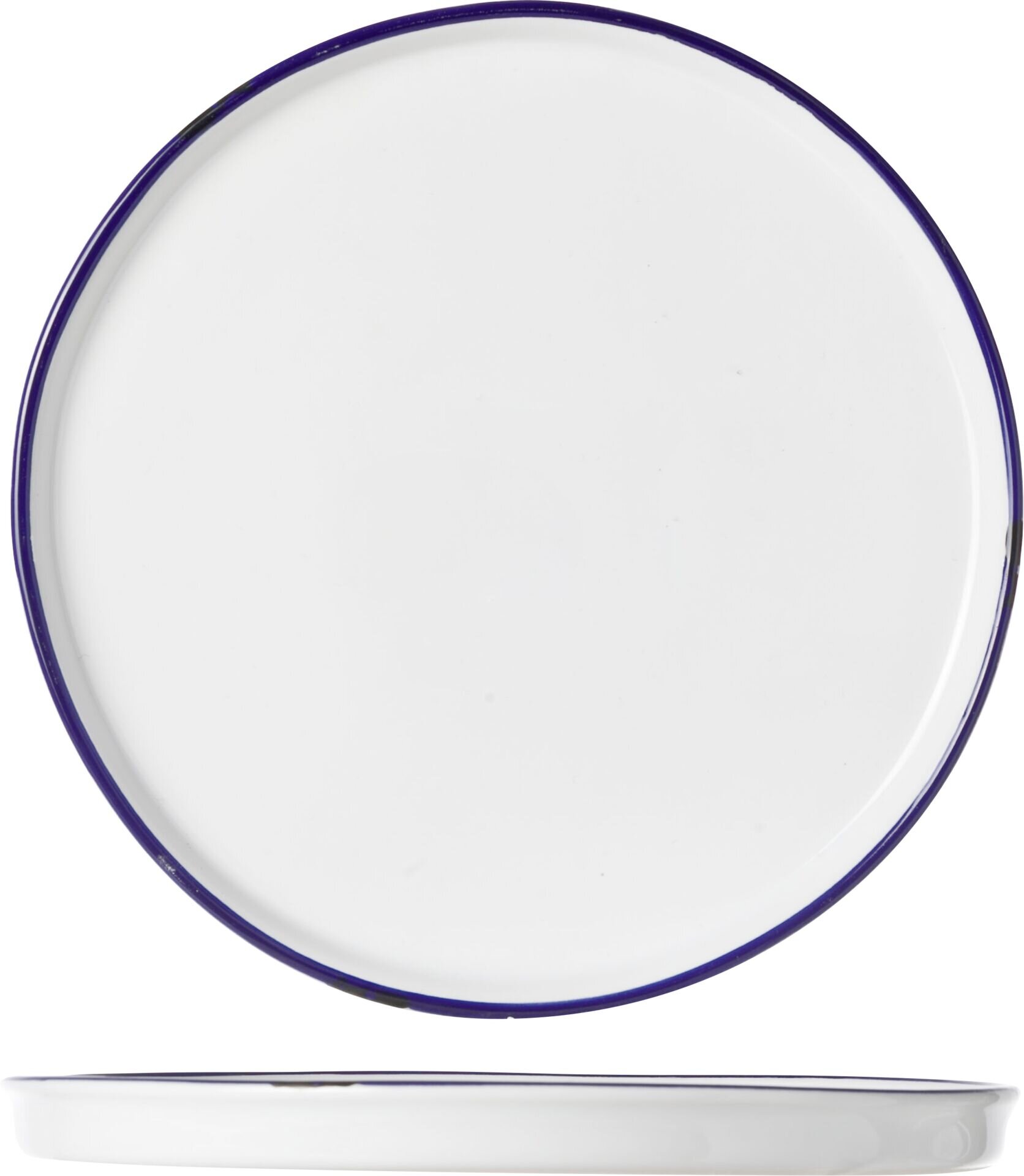 Wie zu Omas Zeiten Steinzeug im Vintage-Look, weiß mit blauem Rand und optisch abgeschlagenen Ecken und Kanten in schwarz. Spülmaschinengeeignet. Ausführung: Teller flach Maße/Inhalt: Ø 26,5 cm