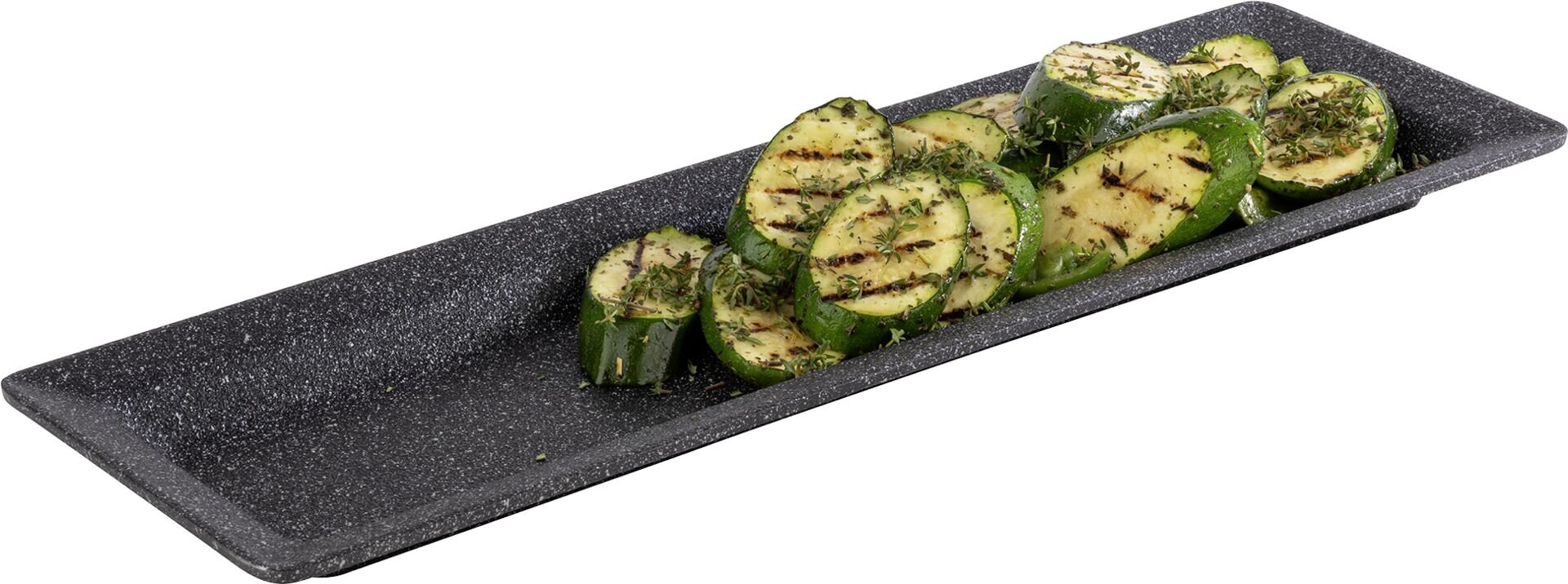 Aluminiumguss, schwarz-silber, antihaftbeschichtet, spülmaschinengeeignet. Temperaturbereich ca. -30 °C bis ca. +200 °C. GN: 2/4 LxBxH in cm: 53x16,2x3