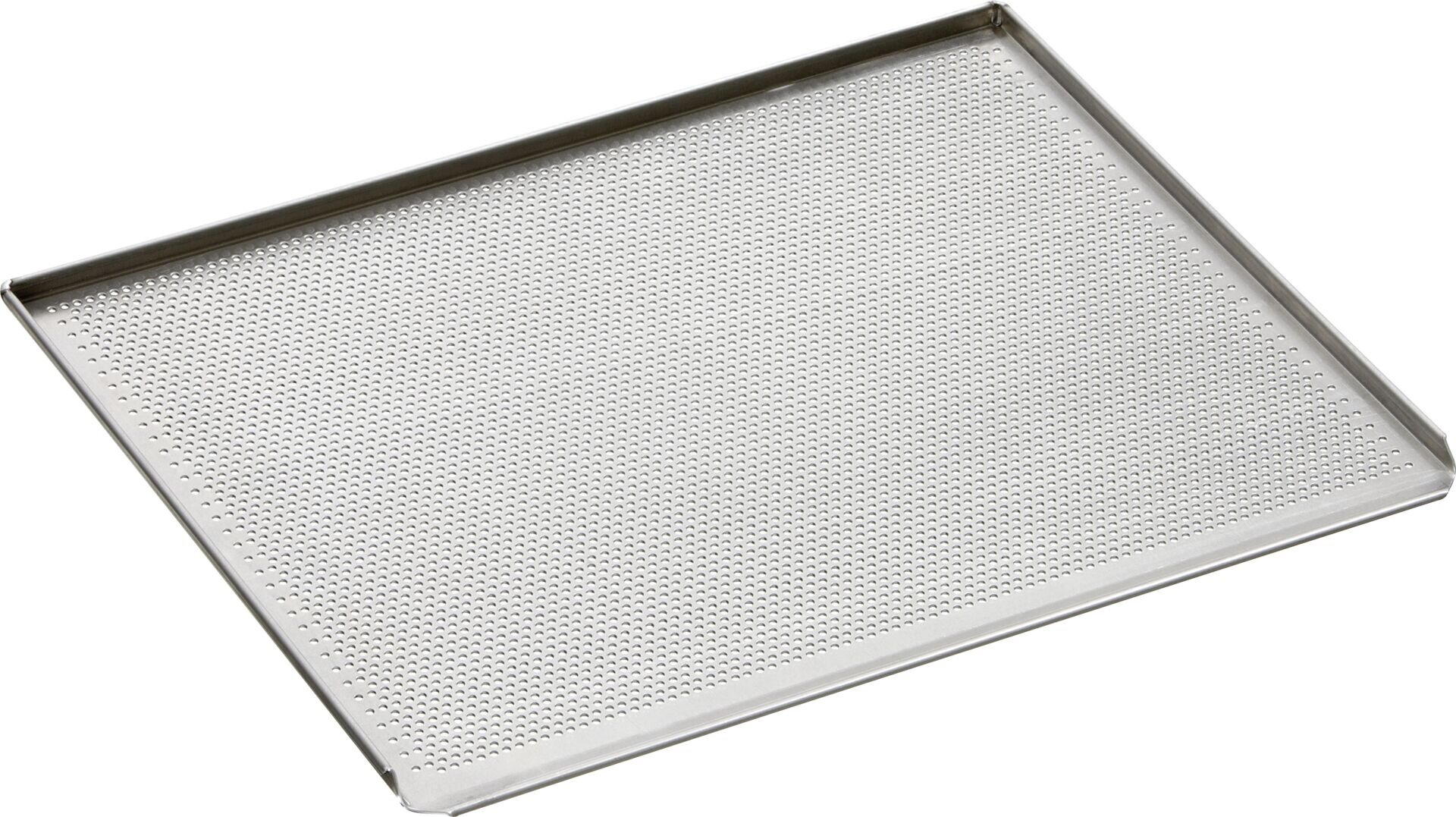 Aluminium. Mit Lochung 3 mm. Mit 3 Seiten Rand. Materialstärke: 1,5 mm. Temperaturbeständig bis 260°C. Passend zu Heißluftofen Art.-Nr. 103000.