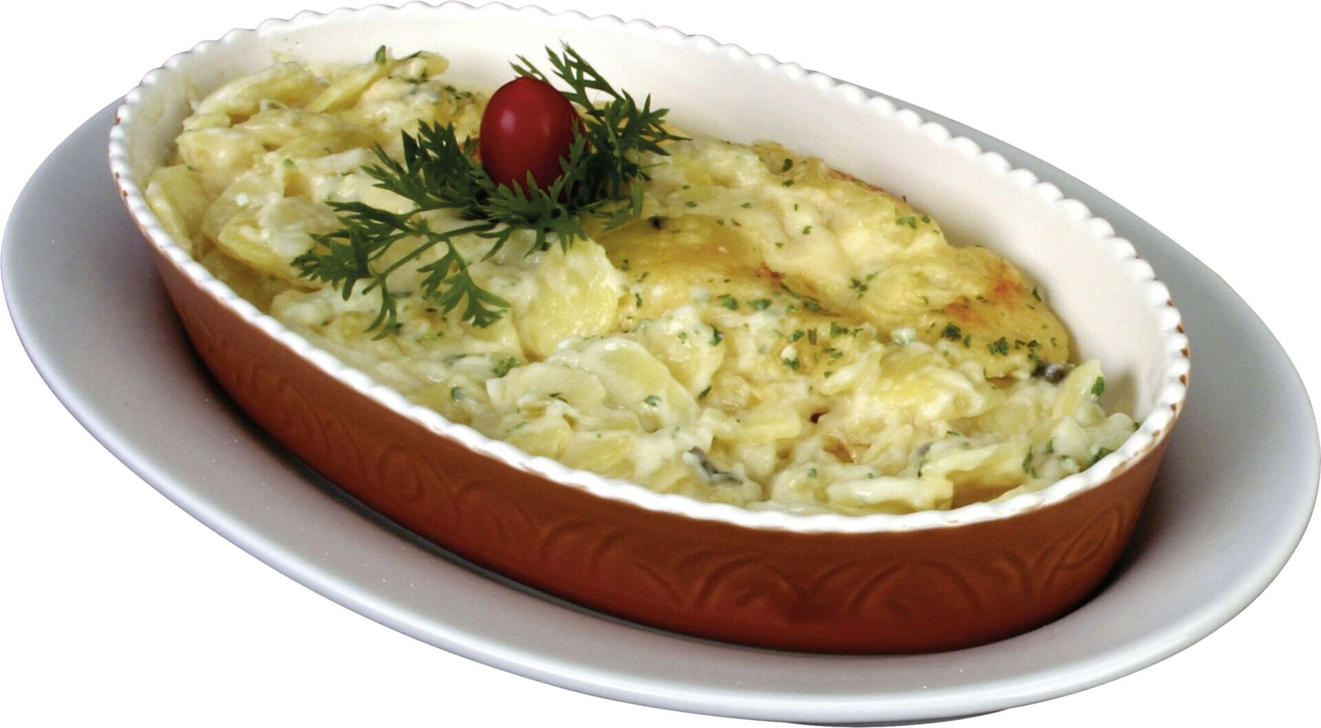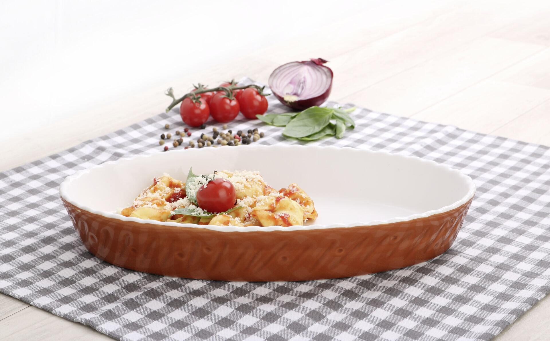 Porzellan, außen ofenbraune Glasur, innen weiß, oval. Feuerfest bis 220°C.