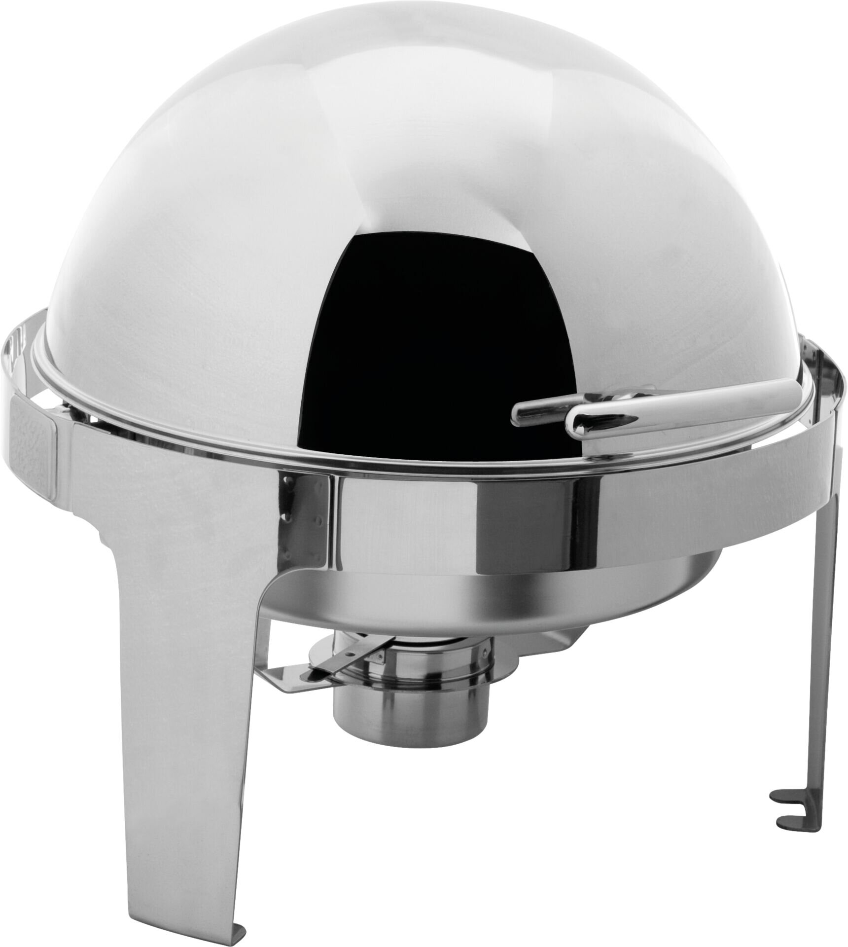 Edelstahl 18/10, poliert, rund mit Rolltopdeckel. Inhalt: 6 Liter. Komplett mit Einsatz 65 mm tief und einem Brennstoffhalter. Schwere Ausführung.