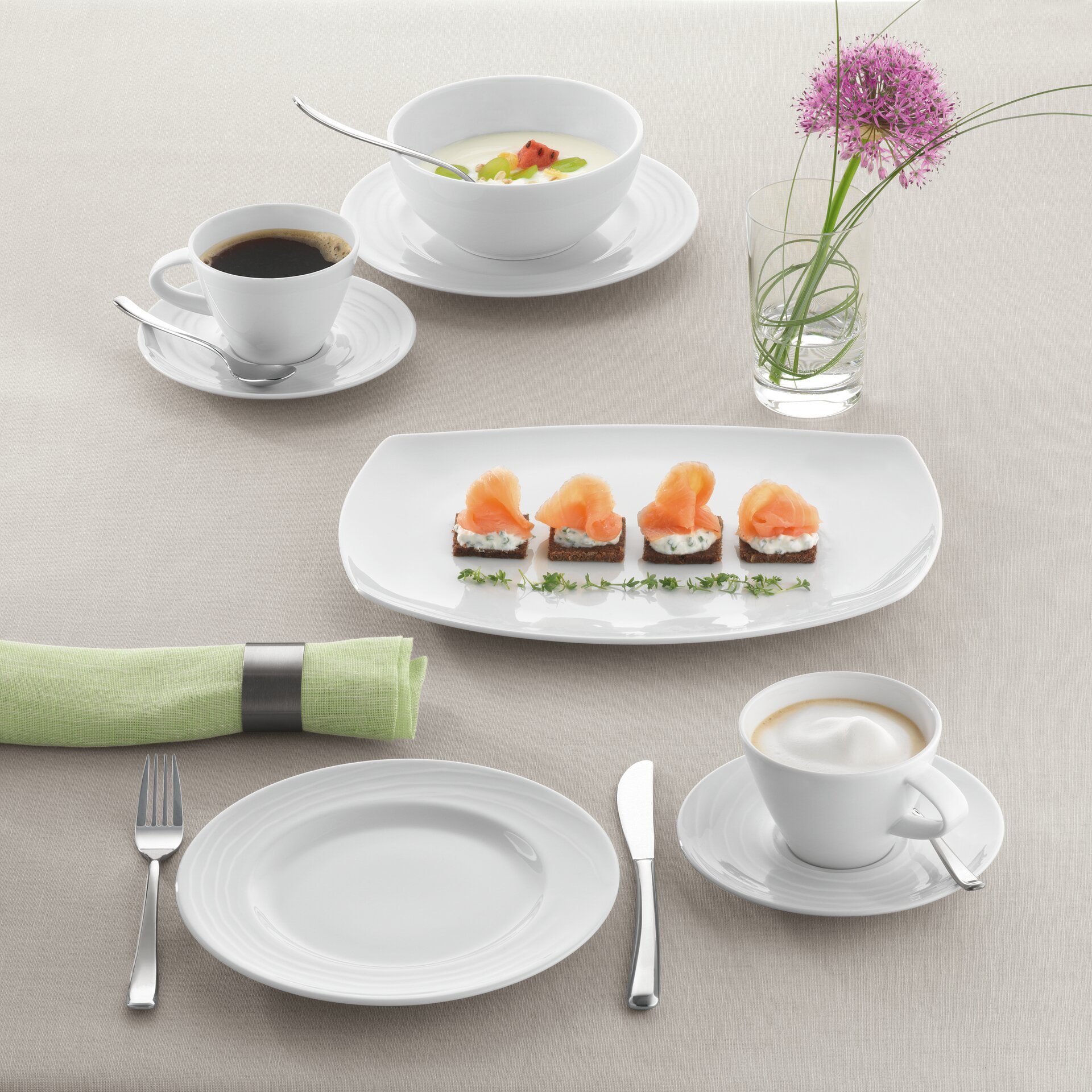 Maître ist nicht ohne Grund in der gehobenen Gastronomie eine der beliebtesten Porzellankollektionen. Das großzügige Design zeigt sich in runden Tellern mit breiter Fahne, Platten mit asymmetrisch gestalteter Fahne, variierenden Tassenformen und einem ergänzenden Struktursortiment. Diese Vielfalt verleiht der Kollektion Individualität und Unverwechselbarkeit. Eigenschaften, die nicht nur bei der Zusammenstellung eines Menüs entscheidend sind, sondern die auch vom anspruchsvollen Gast erwartet werden.