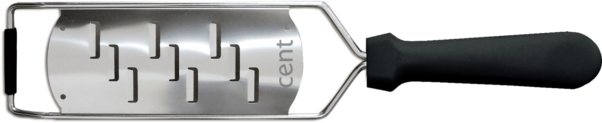 Reibe Edelstahl, schwarzer Kunststoffgriff, oval geformt, 31,5x6,5 cm, Spülmaschinengeeignet, Reinigung per Hand empfohlen.
