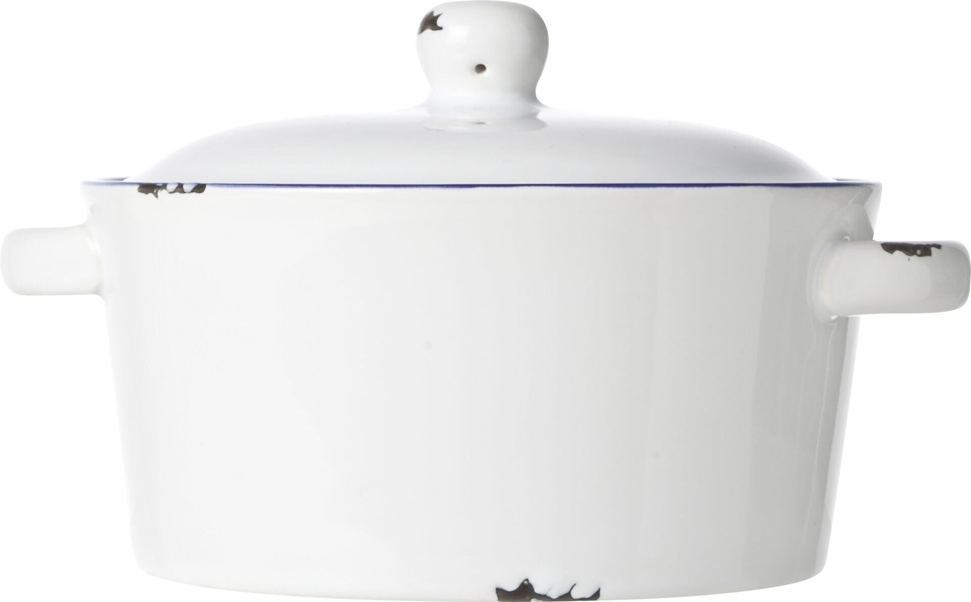 Steinzeug im Vintage-Look, weiß mit blauem Rand und optisch abgeschlagenen Ecken und Kanten in schwarz. Spülmaschinengeeignet.