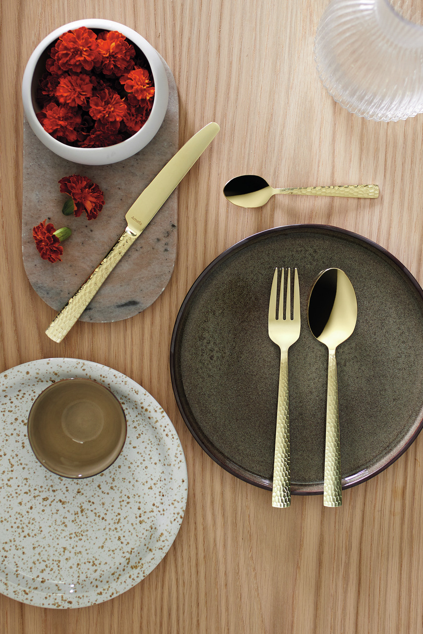 Felicity in Champagner – mit gehämmerter Oberfläche und gerader Form verleiht dieses Besteck deinem Restaurant einen eleganten Look. Passt besonders gut zu leichten, hellen Interieurs oder als Kontrast zu dunklen Möbeln.