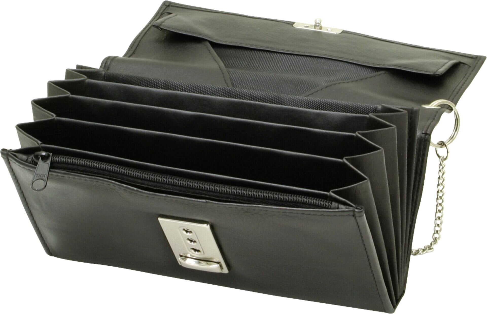 Nappa-Leder schwarz. Schlüsselkette mit Karabinerhaken. Bestehend aus: 1x Münzfach, 5x Scheinfach, 1x schmales Scheinfach, 1x Reißverschlussfach, 1x Steckfach an der Rückseite.