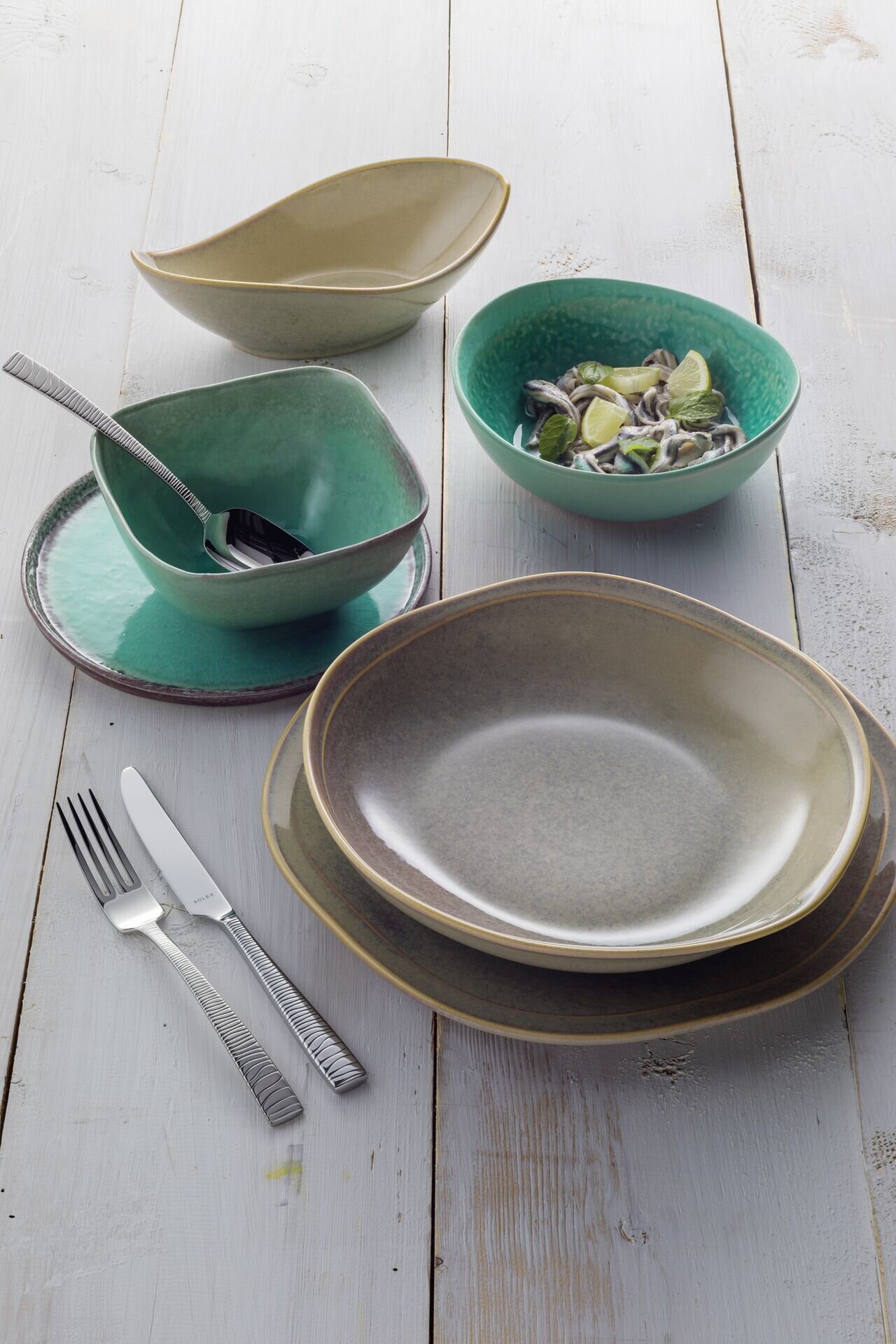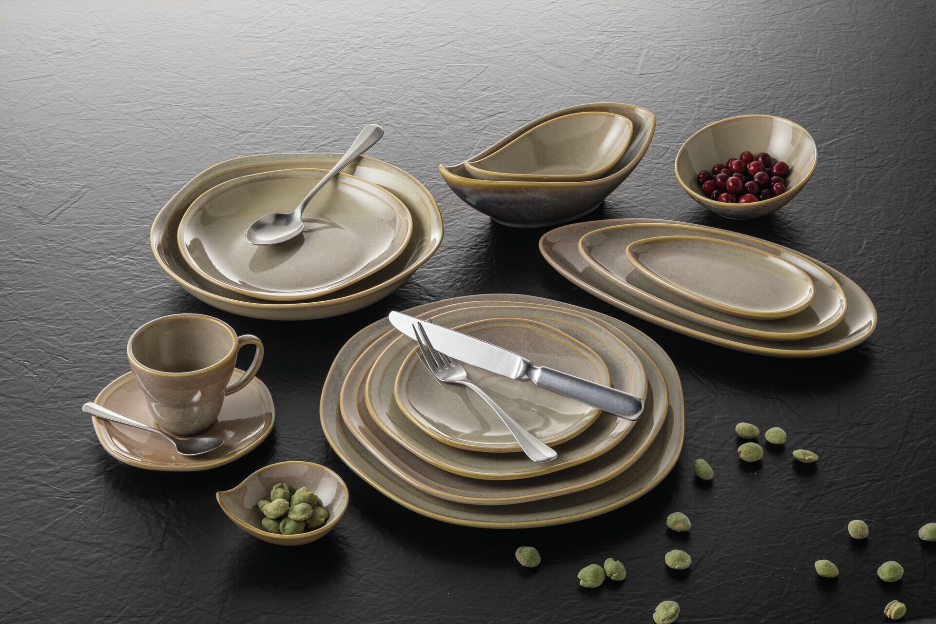 Porzellan in Keramikoptik. Außergewöhnliche Formgebung: Teller mit gewelltem Rand und Schalen in diagonaler Optik. Glasur in fließend ineinander übergehenden Beige- und Erdtönen - so wird jedes Stück zum Unikat. Mischsortierung. Spülmaschinengeeignet.