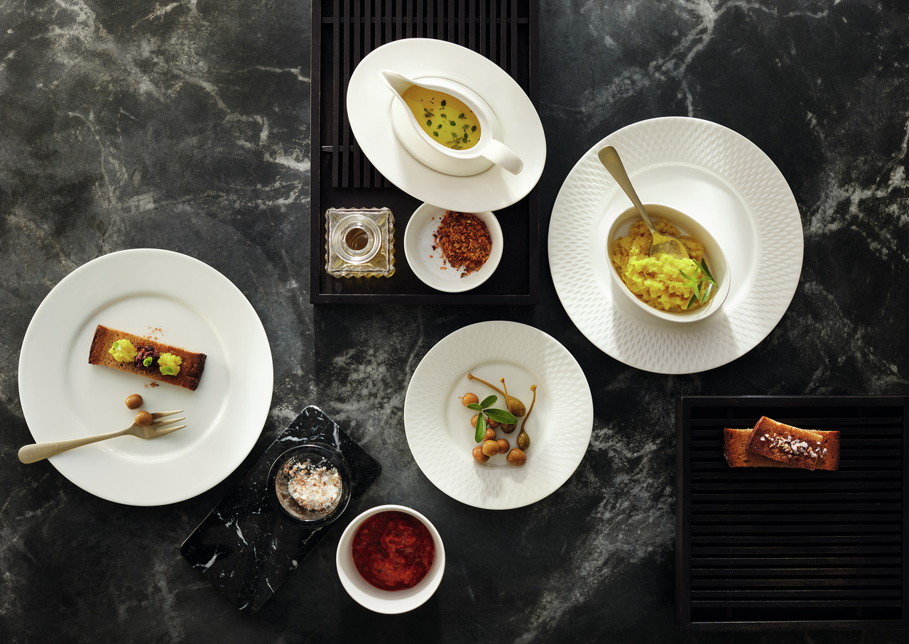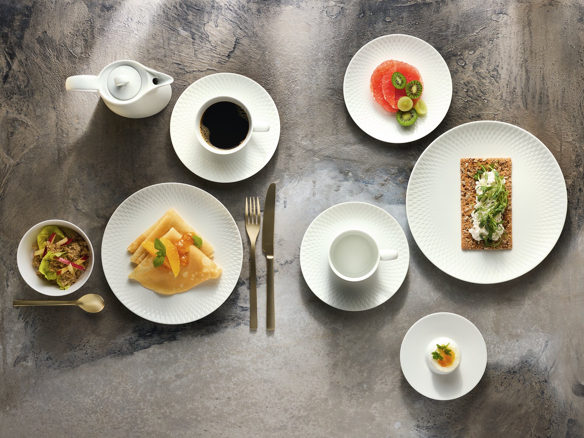 Die elegante Kollektion PURITY aus NOBLE CHINA wird mit einem grafischen, facettenschliffartigen Relief auf der Fahne versehen. Es entsteht ein spannendes Licht-und Schattenspiel: das Relief reflektiert bei jedem Drehen das Licht anders. Dabei funkelt das Relief wie ein Diamant.