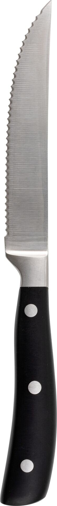 Edelstahl mit schwarzem POM-Griff, Messer mit Wellenschliff. Spülmaschinengeeignet.