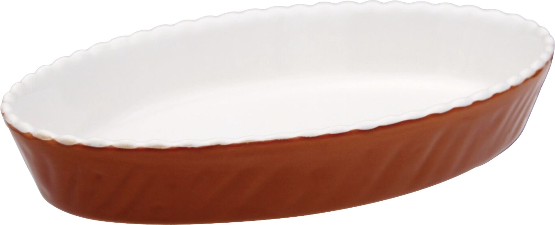 Porzellan, außen ofenbraune Glasur, innen weiß, oval. Feuerfest bis 220°C.