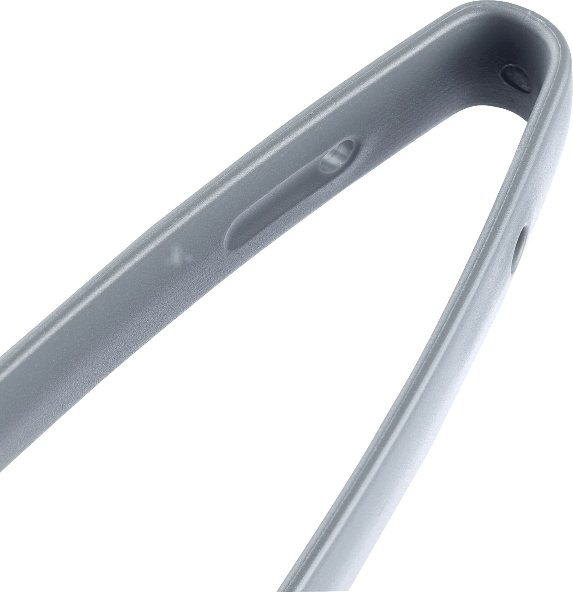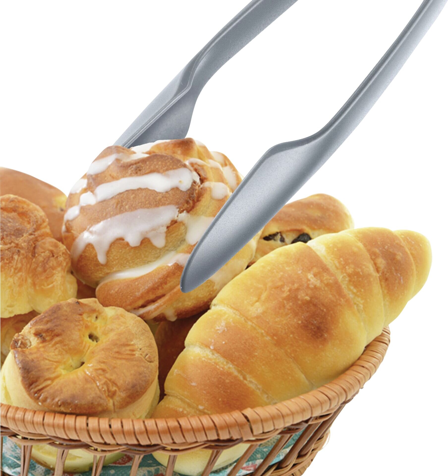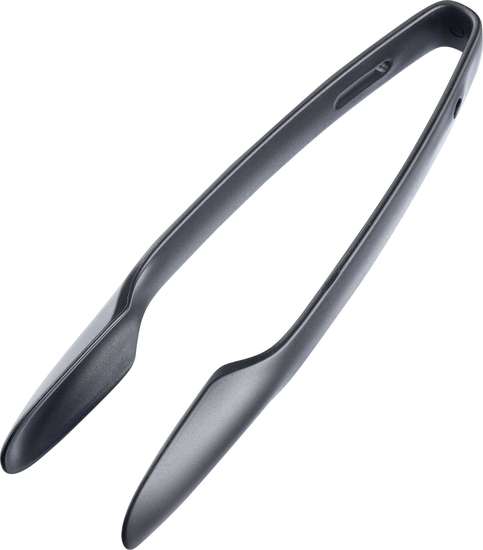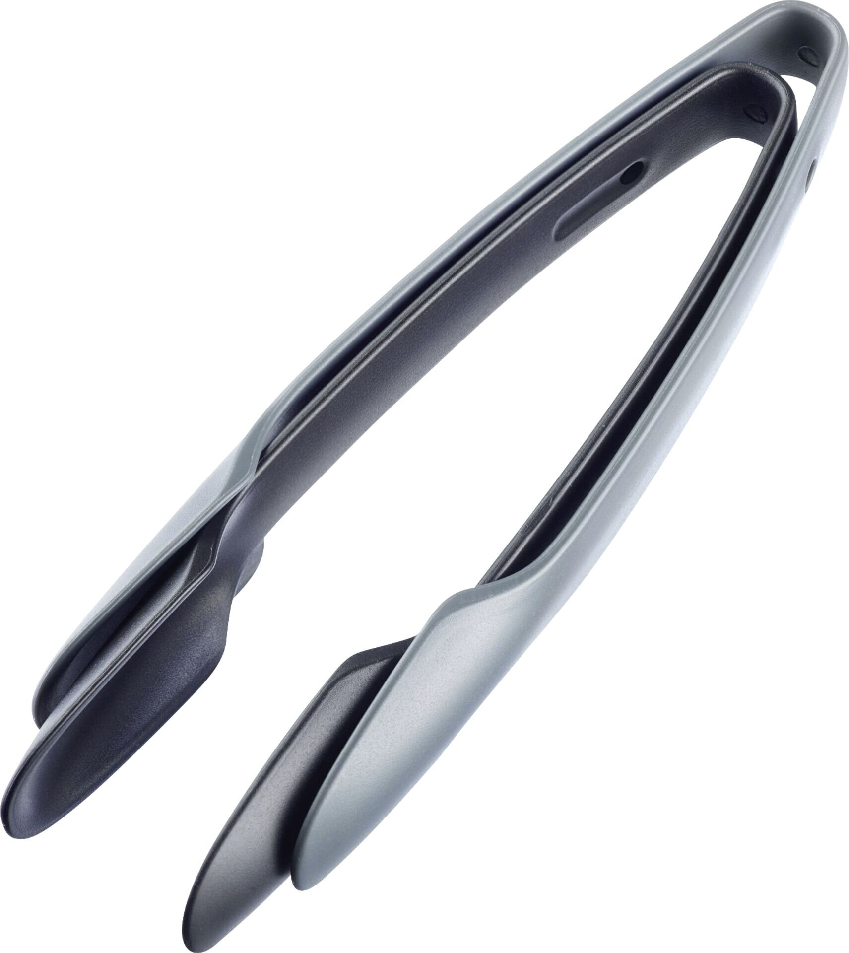 PP, stabiles Zangenset (schwarz/grau), hält auch kleine, rutschige oder ölige Lebensmittel wie z.B. Oliven oder Eiswürfel sicher durch eine spezielle Ausformung, ineinander geklickt platzsparend aufbewahrt, spülmaschinengeeignet.