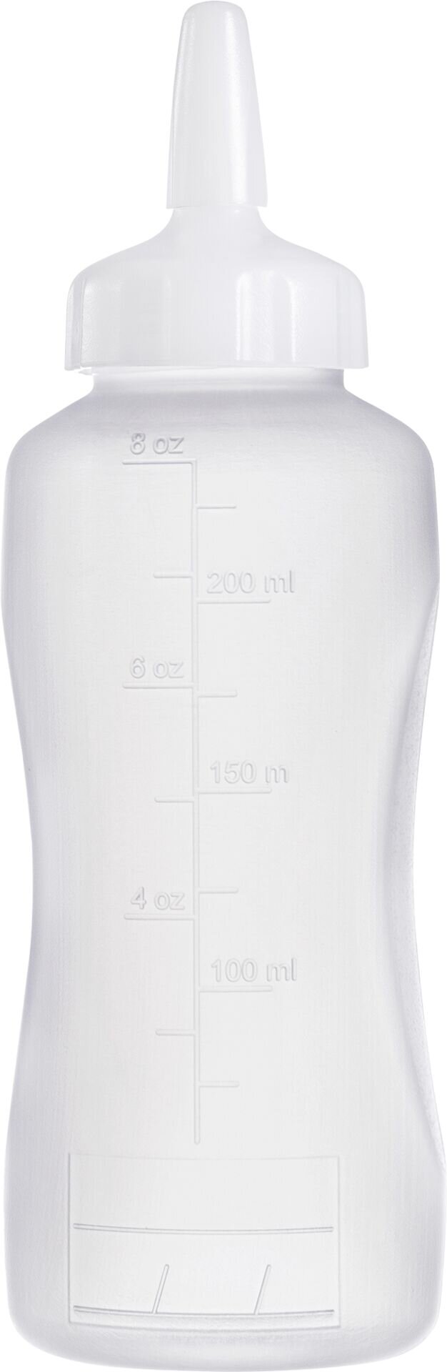 HDPE (Hart-Polyethylen, transparent). Spülmaschinengeeignet.