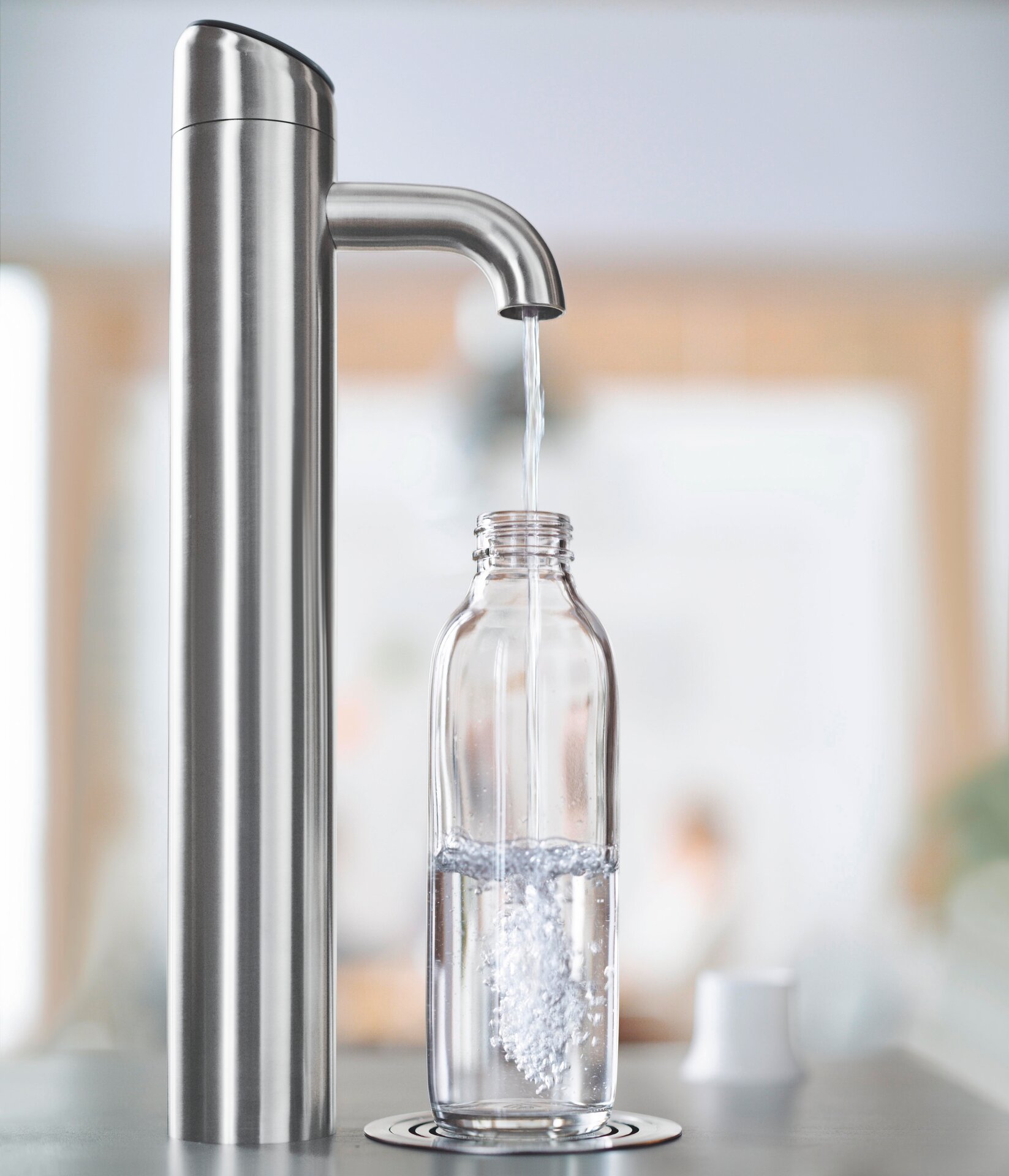 › Wasserspender als stilvoller Blickfang: nur die hochwertige Zapfsäule ist sichtbar, der Karbonator verschwindet im Unterschrank