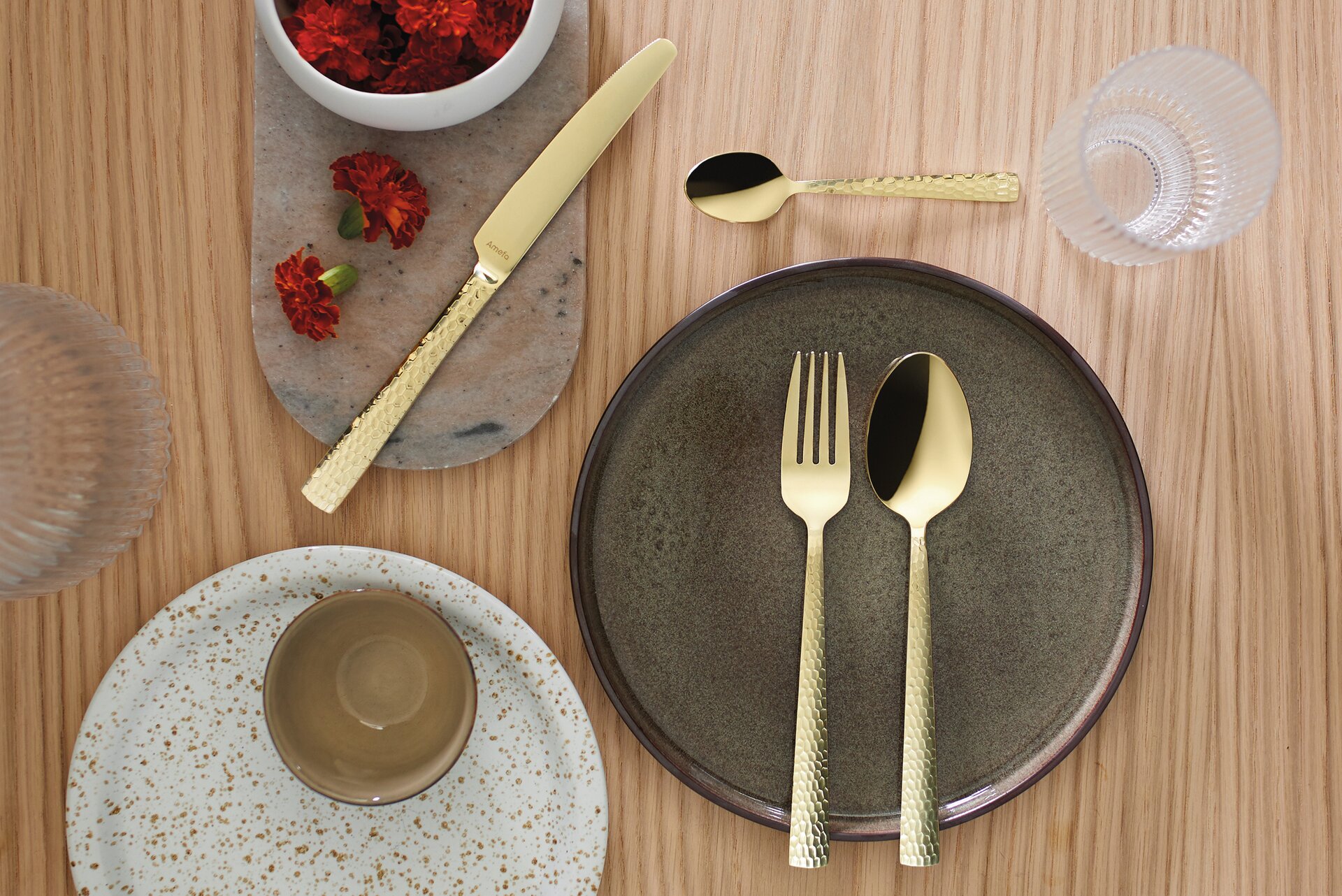 Felicity in Champagner – mit gehämmerter Oberfläche und gerader Form verleiht dieses Besteck deinem Restaurant einen eleganten Look. Passt besonders gut zu leichten, hellen Interieurs oder als Kontrast zu dunklen Möbeln.