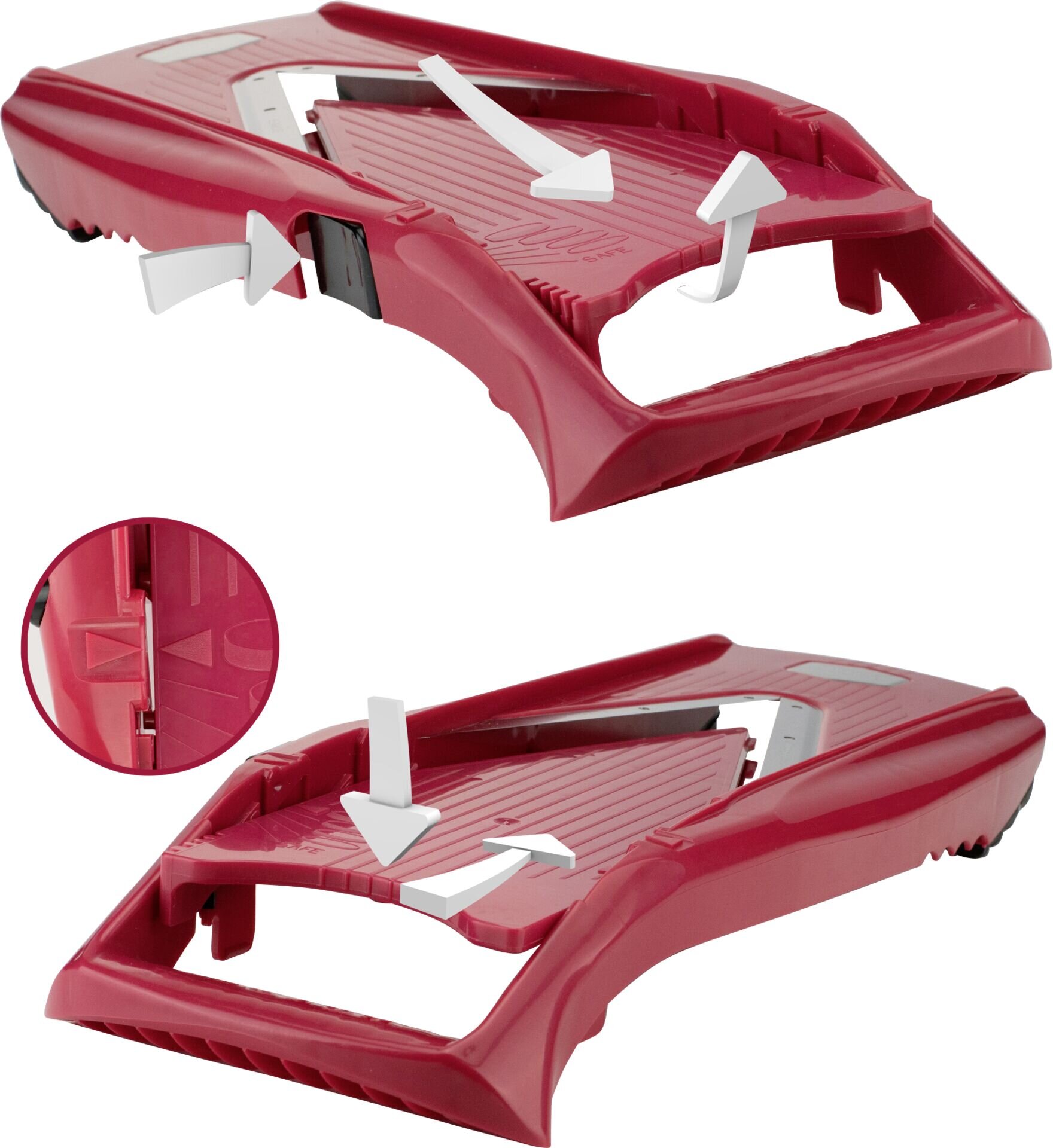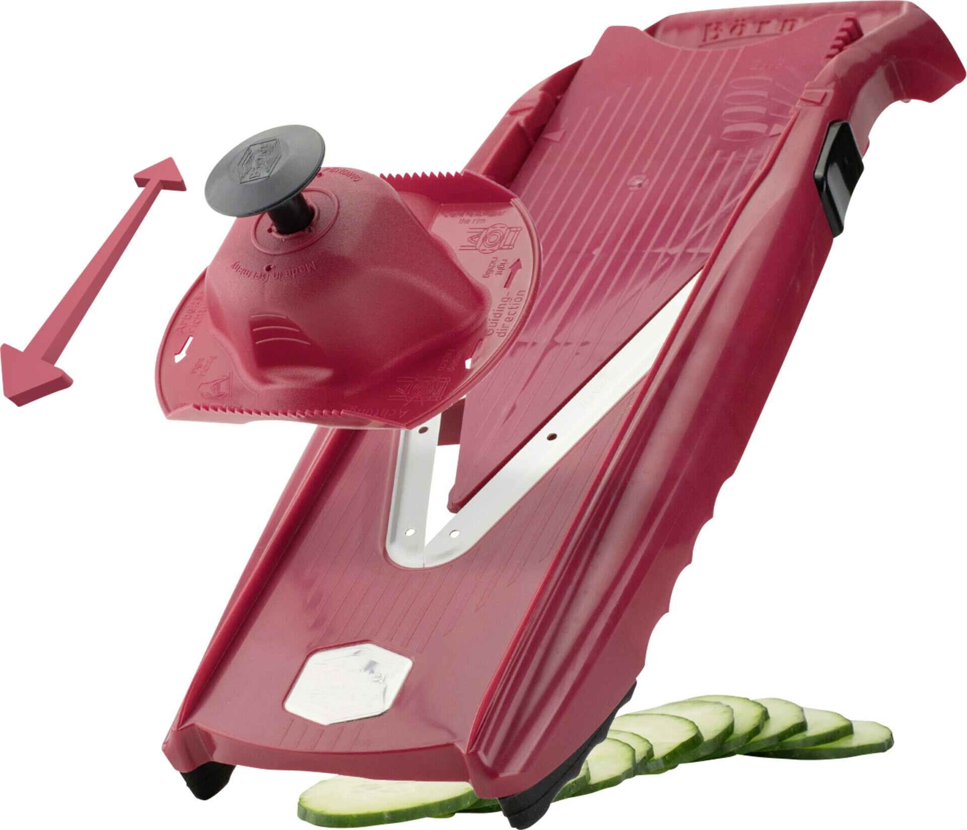 ABS, Klinge Edelstahl. Ergonomischer Griff. Knopf für Schnitthöheneinstellung. Sicherheitsposition für zusätzlichen Schutz. Rutschfeste Gummifüße. Inklusive 3,5mm und 7mm Einschub, Sicherheitsfruchthalter. Schnittstärken von 1,2mm bis 7mm möglich. Verschiedene Möglicheiten, Scheiben, Würfel, Stifte.