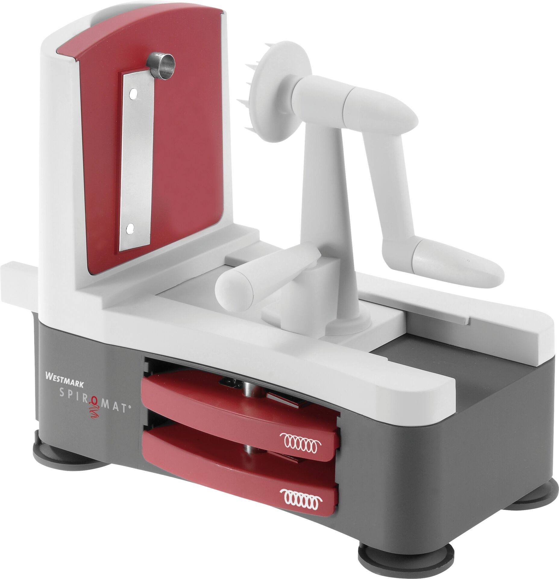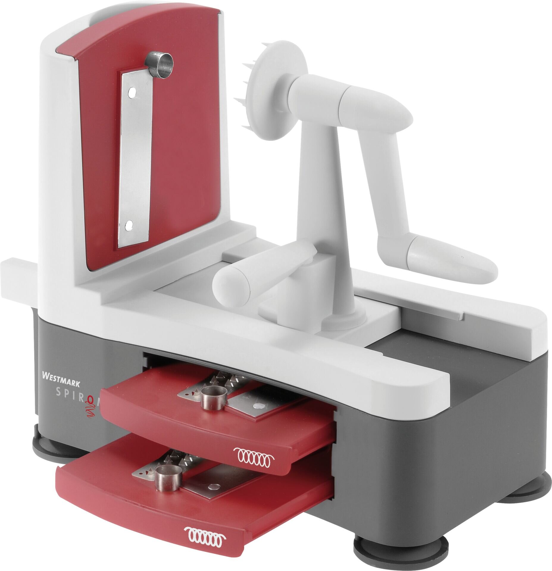 ABS, Edelstahl. Für Obst und Gemüse. 3 sehr scharfe Klingen-Einsätze sorgen für Abwechslung. Praktisch: die jeweils nicht genutzten Schneideinsätze werden schubladenförmig in das Gerät eingesteckt. 4 Gummi-Saugfüße für festen Halt. Spülmaschinengeeignet.