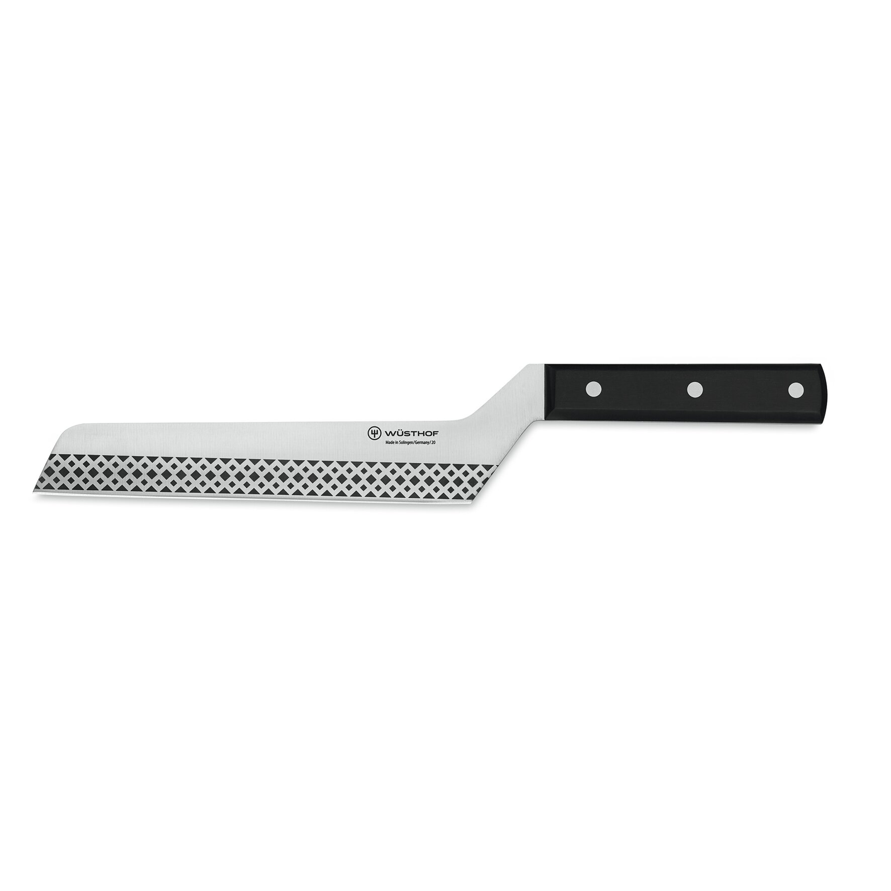 Käsemesser für Hartkäsesorten, wie zum Beispiel Emmentaler, Gruyère, Comté und viele Bergkäsearten oder für Schnittkäse wie Gouda, Edamer, Tilsiter und viele weitere. Das Käsemesser weist eine stabile Klinge und eine scharfe Schneide auf und sorgt für ein sauberes Schnittbild. Eine Spezialätzung auf der Klinge vermeidet zudem das Anhaften von Käsescheiben. Für Weichkäse empfehlen wir das Weichkäsemesser, für ein perfektes Frühstück zusätzlich unser Brötchenmesser.