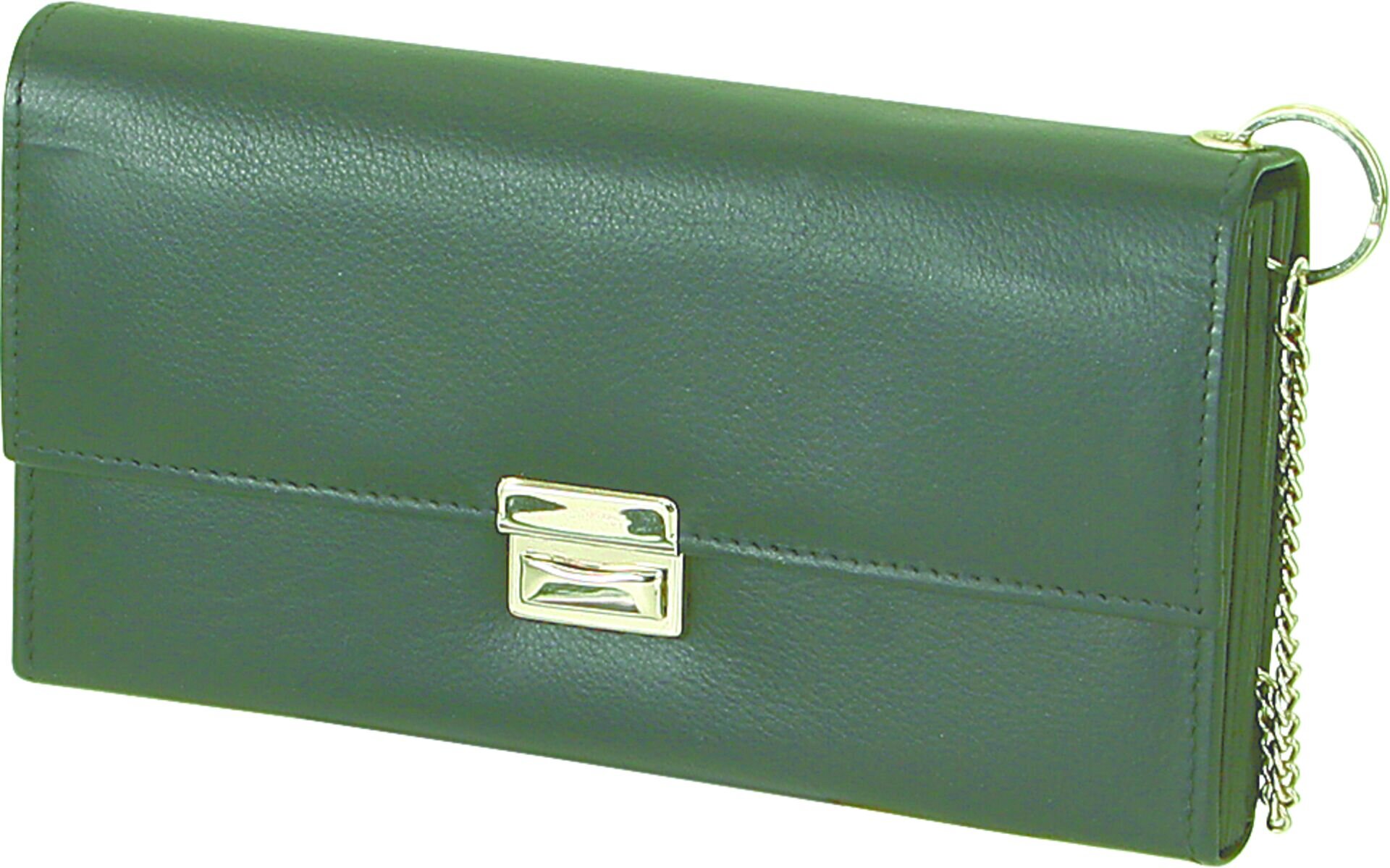 Nappa-Leder schwarz. Schlüsselkette mit Karabinerhaken. Bestehend aus: 1x Münzfach, 5x Scheinfach, 1x schmales Scheinfach, 1x Reißverschlussfach, 1x Steckfach an der Rückseite.