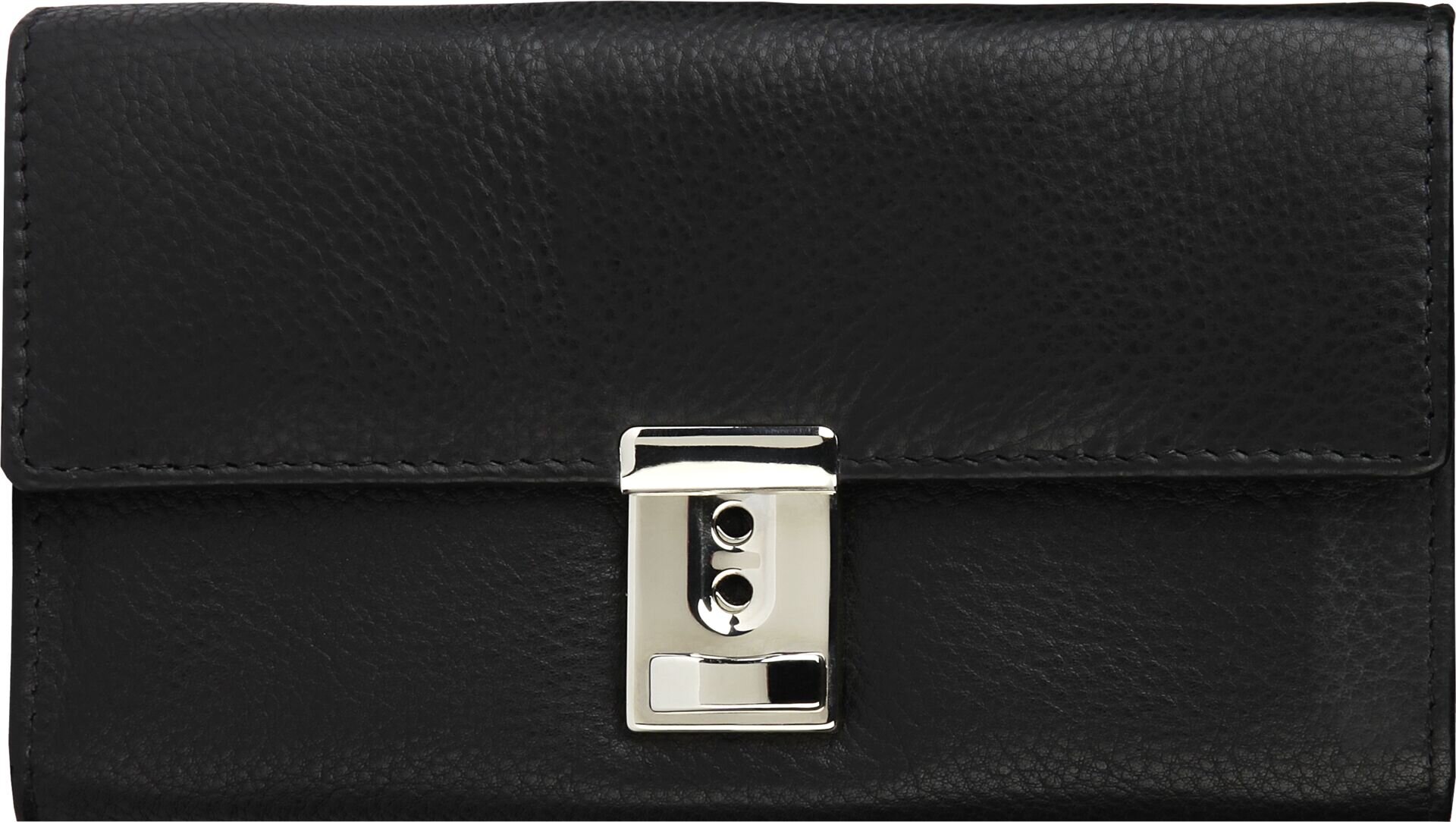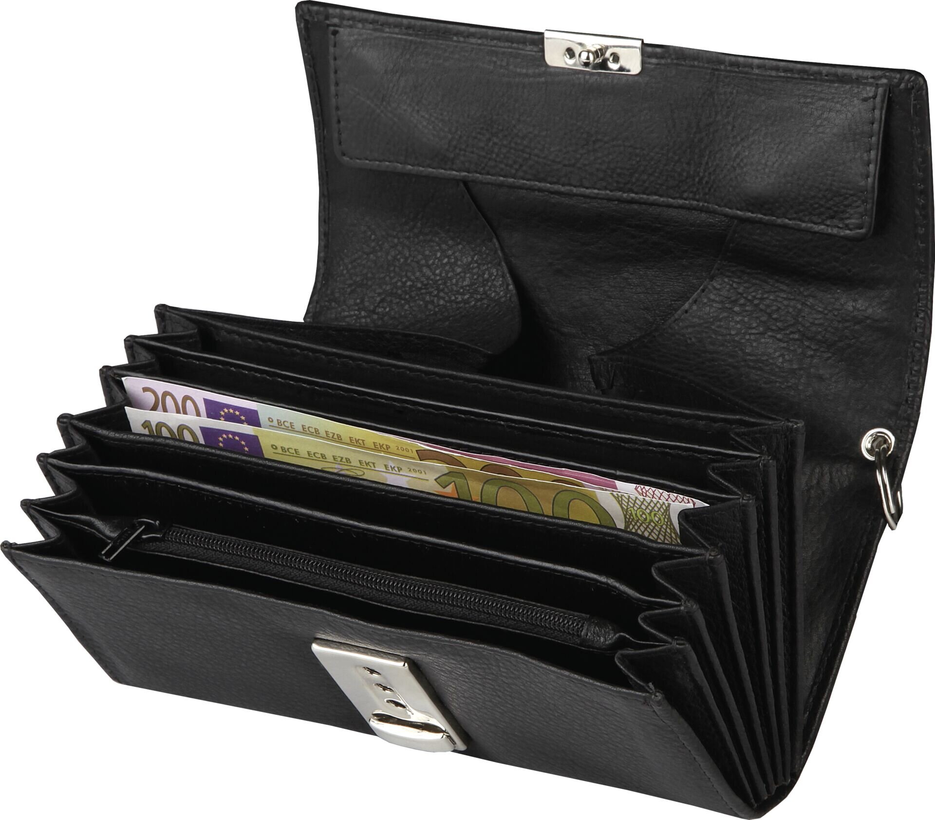 Kalbsnappaleder schwarz, hohe Qualität. Schlüsselkette mit Karabinerhaken. Münzfach mit Leder abgefüttert. Bestehend aus: 1x Münzfach, 5x Scheinfach, 1x schmales Scheinfach, 1x Reißverschlussfach, 1x Steckfach an der Rückseite. Weiche Haptik.