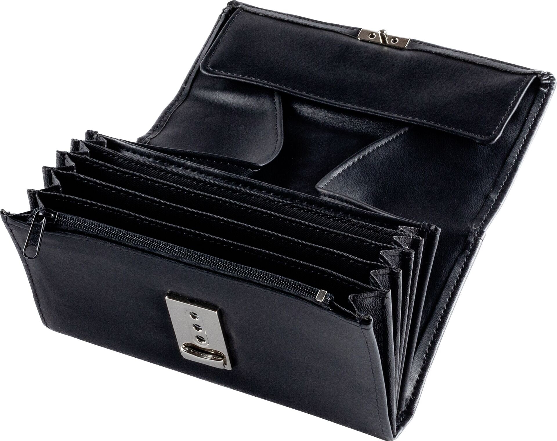 Polyurethan-Kunstleder (PU-Kunstleder), OHNE ÖSE u. OHNE SCHLÜSSELKETTE. Besteht aus: 1x Münzfach, 7x Scheinfach, 1x Reißverschlussfach, 1x Steckfach an der Rückseite.