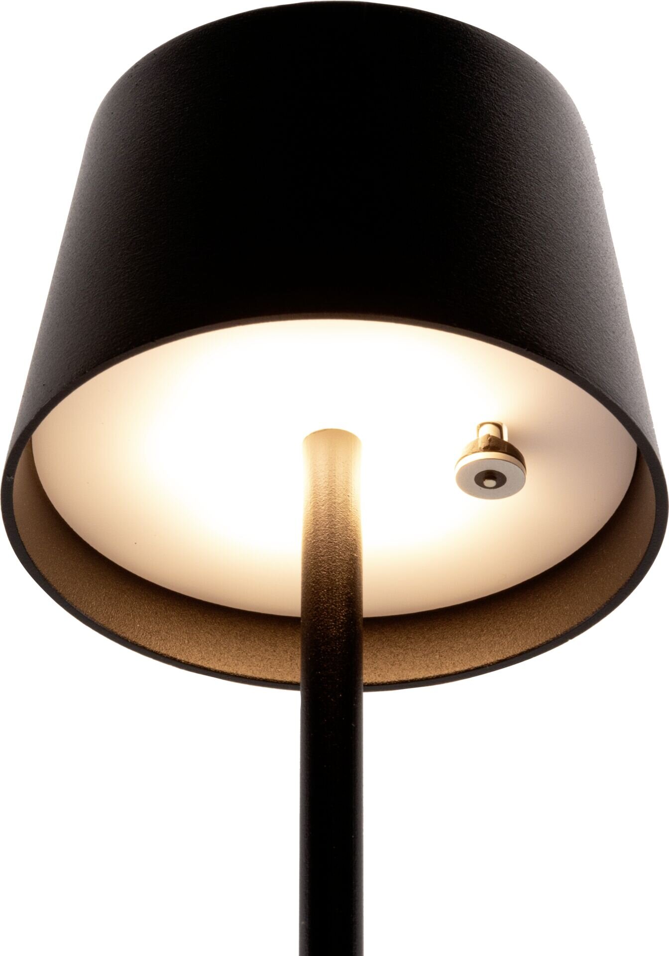 Tischleuchte mit integr. LED und Akku. Stufenlos dimmbar. Wasserdicht nach IP54. Inkl. magnetischem USB Schnellladekabel. Lichttemperatur: 2700K. LxBxH in cm: 7,5x7,5x22 Leuchtdauer: bis zu 20 Std Farbe: schwarz