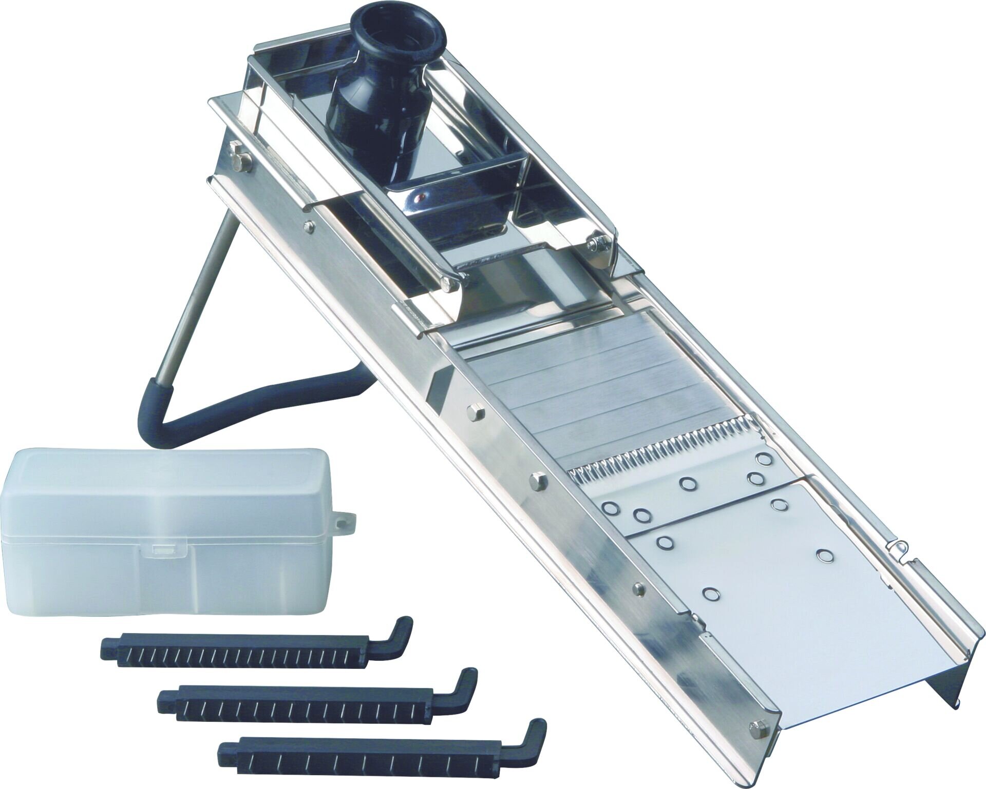 Edelstahl 18/10, rostfrei. Inkl. 3 verschiedener, auswechselbarer Schneidkämme (Streifen mit 4, 6 und 10 mm Breite) und Restehalter. Gewicht in kg: 1,7.