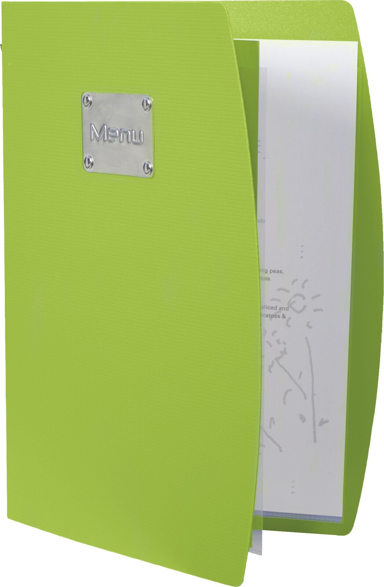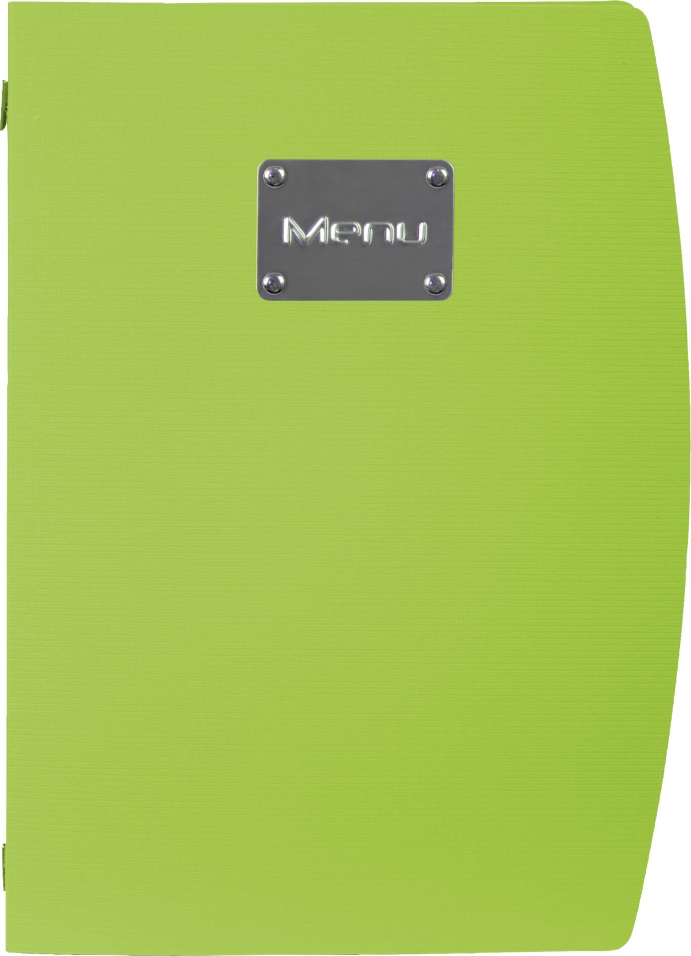 Moderne Strukturkarte aus Kunststoff (PP). Edelstahlschild mit Aufdruck „Menu“, inkl. 1 Doppeleinlage. Für bis zu 10 Einleger geeignet. Heftung: Gummiband mit Doppeleinlage (4 Seiten). Leicht zu reinigen.