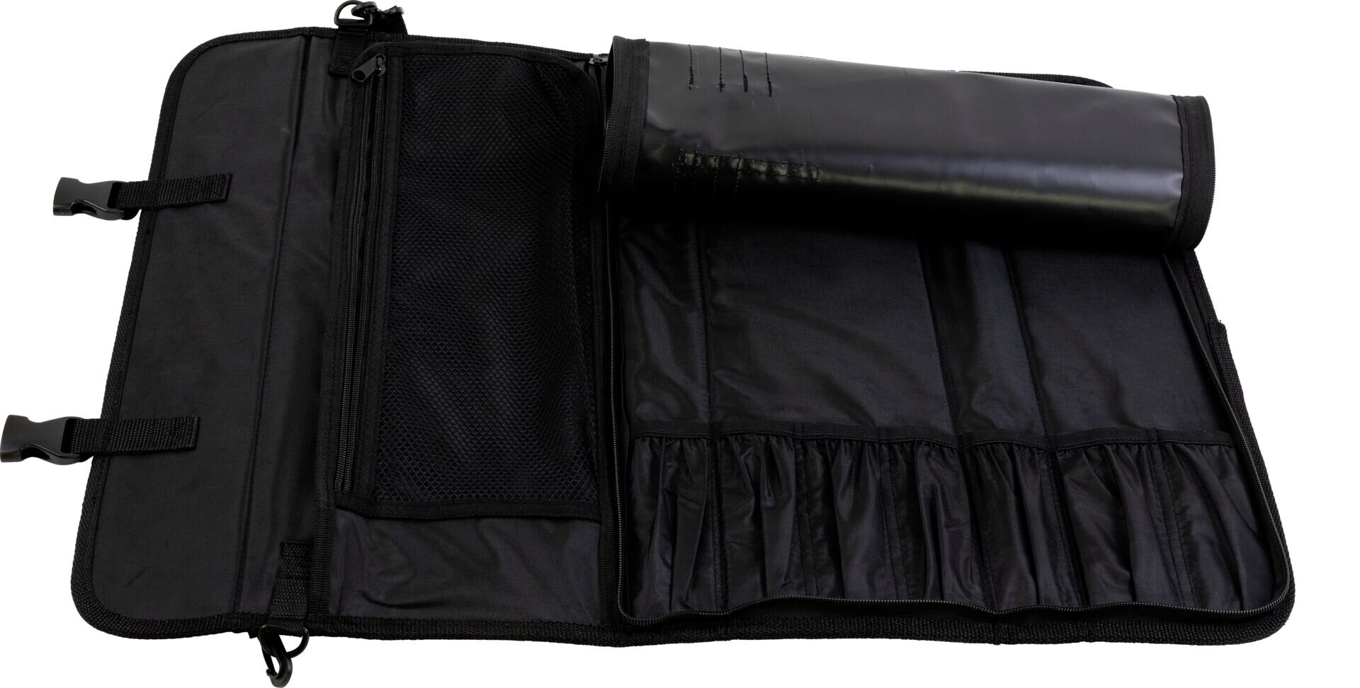 Für mind. 7 Messer und viele weitere Accessoires. Hauptfach für 7 Messer mit einer max. Gesamtlänge von je 50 cm. Die Messer werden mit einem Gummiband gehalten und sind mit einer Abdeckung geschützt, die 3 Stiftfächer, 4 Visitenkartenfächer, sowie Platz für einen Notizblock (ca. 10x12 cm) beinhaltet und mit einem Reißverschluss fixiert ist. Zusätzliches Netzfach (ca. 13x39 cm) bietet sicheren Platz z. B. für eine Küchenschere oder sonstige Kleinteile. Dieses dient als Abdeckung für weitere 3 Accessoires – z. B. Wetzstahl, Fleischgabel, Handreibe (werden jeweils auch mit einem Gummiband gehalten) und ist mit 2 Klettverschlüssen fixiert. Rückseite mit transparentem Fach für Namenskärtchen/ Adresse und weiterem Reißverschlussfach (ca. 12x49 cm). Längenverstellbarer Klickverschluss, abnehmbarer Schultertragegurt (längenverstellbar) und Tragegriff. Aus strapazierfähigem Textilgewebe, reiß- und abriebfest. Abmessungen geschlossen: ca. 52x18x7 cm. Farbe: schwarz mit orangem Streifen. Ohne Inhalt.