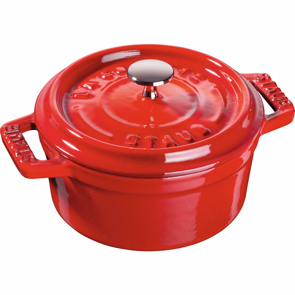Die Cocotte ist ein französischer Schmortopf, in dem vor allem Gerichte wie Ragouts, Gratins, Suppen und Soufflés zubereitet werden. Der Topf eignet sich dazu hervorragend, weil das scharfe Anbraten und das anschließende Garen im gleichen Kochgeschirr stattfinden. Gusseisen wird schon lange für Schmortöpfe verwendet. Die spezielle Emaillierung von Staub verstärkt die bereits vorhandenen Eigenschaften des Materials: Denn Gusseisen nimmt die Hitze aus der Herdplatte sehr gut auf und speichert sie lange. Die Wärmeabgabe erfolgt dann langsam und stetig. Auf diese Weise gelingt nicht nur das schonende Garen, sondern Sie können auch die Speisen in der Cocotte gut warmhalten. Ein weiterer Vorteil der Emaillierung ist die Förderung des Eigengeschmacks der Speisen. Anstatt das Gemüse zu verkochen, bleibt es in der Cocotte von Staub schmackhaft und aromatisch, während Fleisch saftig und zart wird. Aufgrund der 10 cm Durchmesser und des Fassungsvermögens von 0,25 l eignet sie sich vor allem für kleine Speisen oder einzelne Portionen, die dann in dem stilechten Topf am Tisch serviert werden können. Mit den Cocottes von Staub gelingen Anfängern und Hobbyköchen Gerichte aus der französischen Küche mit Leichtigkeit.