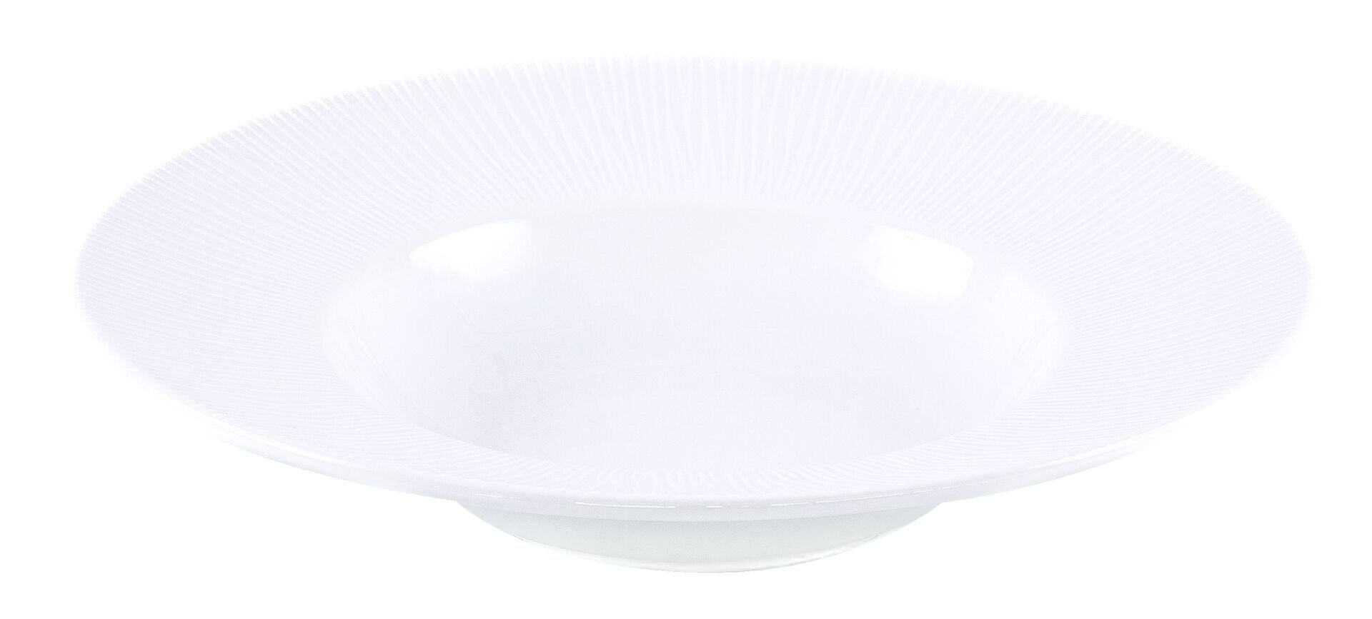 Teller aus weißem Porzellan mit breiter Fahne (6cm) im Rillen-Design. Mischsortierung. Spülmaschinengeeignet.