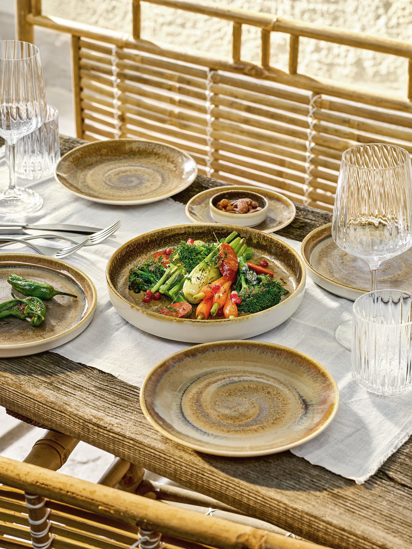 Die Grün-, Braun- und Blautöne erinnern an die mediterrane Pflanzenwelt, an Meer und Terracotta. Reaktive Glasuren sorgen für besondere Effekte und handwerkliche Unikate. Die Artikel von PERFECT MATCH sind in fünf kombinierbaren Farben erhältlich.