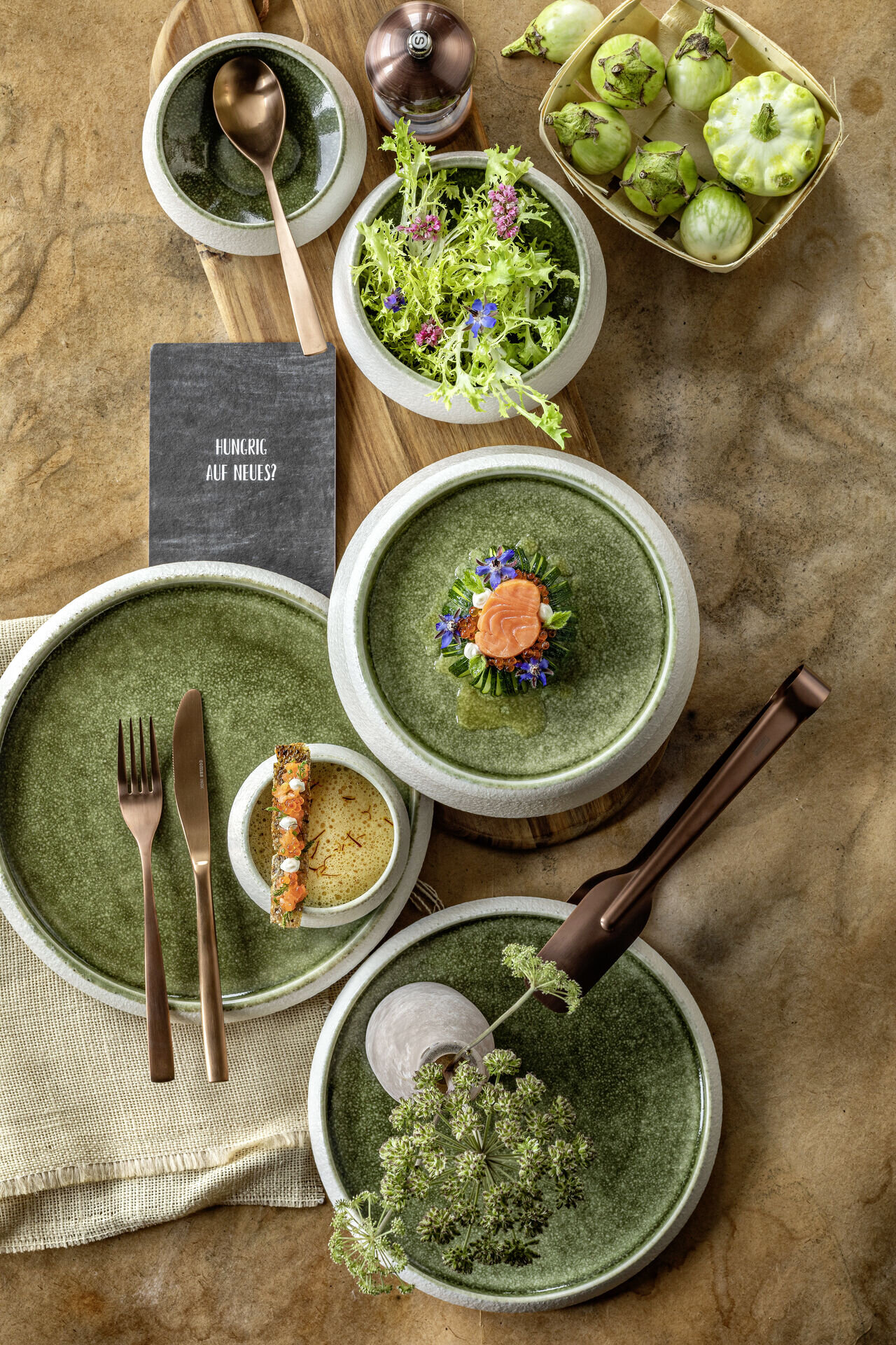 Porzellan. Tellerspiegel und Schüsselinnenseite mit glatter, glänzender Glasur in natürlichen Grüntönen. Von außen besticht die Serie durch die ungleichmäßig strukturierte, mattweiße Glasur. Die kantige Form der Bowls, der erhöhte Rand der Teller und der unregelmäßige Farbverlauf sind weitere Besonderheiten und unterstreichen die Einzigartigkeit jedes Stücks dieser modernen Serie. Die Bowls lassen sich stapeln und mit den Tellern gut als Deckel oder Unterteller kombinieren. Mischsortierung. Spülmaschinengeeignet.