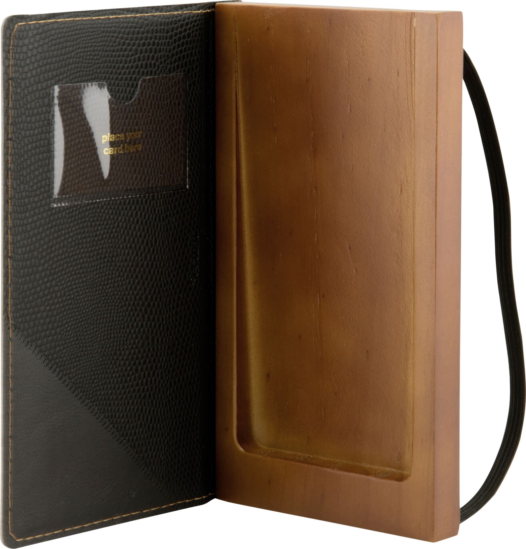 Polyurethan Rechnungsmappe (Lederoptik) mit handgestickten Seitenrändern und hölzernem Münzhalter. Einsteckfach für Karten. Mittels elastischem Band leicht zu schließen.