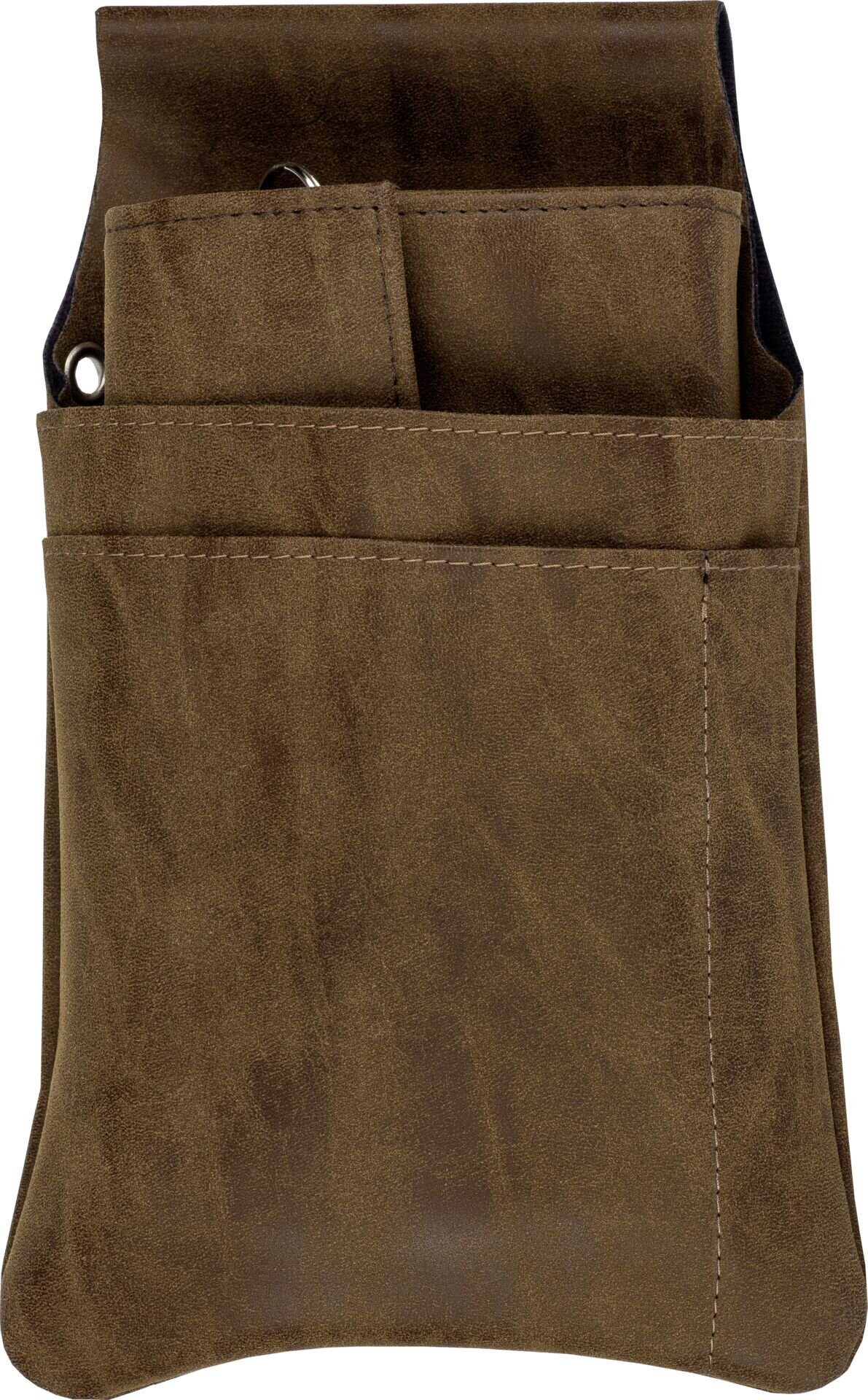 Kunstleder (Nubuk)/Feinsynthetik, dunkelbraun. 1 Fach für die Kellnerbörse und 1 Zusatzfach für Notizblock und Kugelschreiber.
