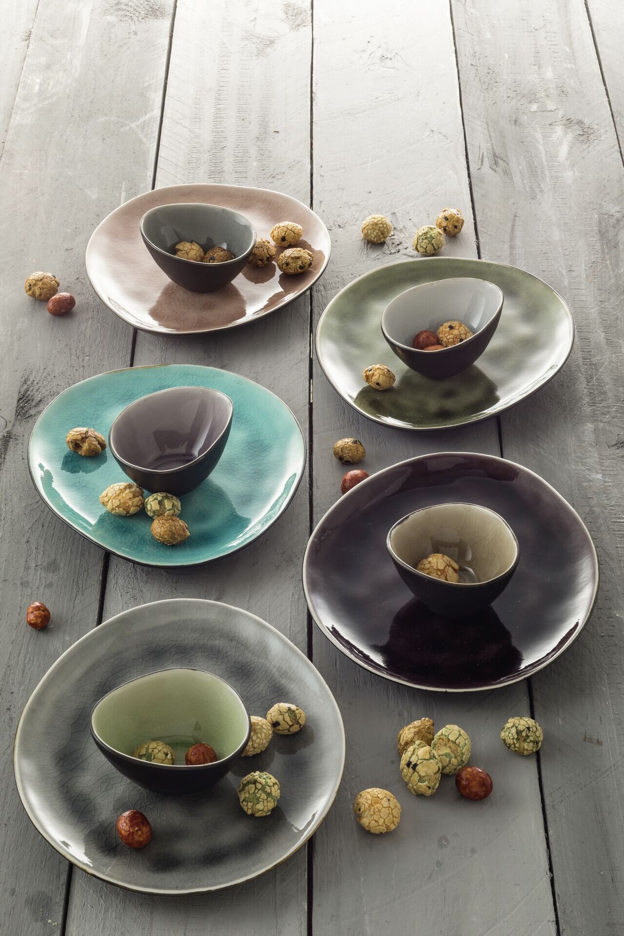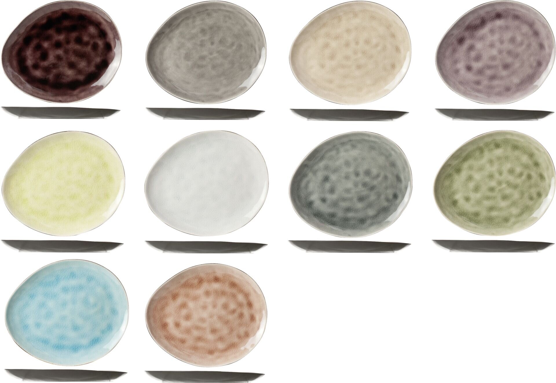 Steinzeug, in 10 verschiedenen Farben. Farbe changiert. Innen glänzend, außen schwarz matt. Jedes Teil individuell. Farbig sortiert. Im 10er Set. Spülmaschinengeeignet. Ausführung: Platte Maße/Inhalt: 19,5x16 cm