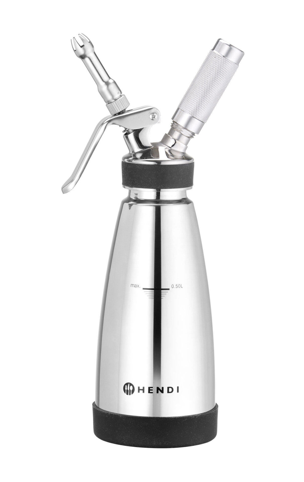ØxH in cm: 9,5x27,5 Inhalt in Liter: 0,5 Aus doppelwandigem Edelstahl. Rutschfester Basisring aus Silikon. Siphon eignet sich sowohl für heiße als auch für kalte Saucen. Enthält 3 verschiedene Edelstahldüsen, eine Gaskappe und eine Reinigungsbürste. Für Geschirrspüler geeignet.
