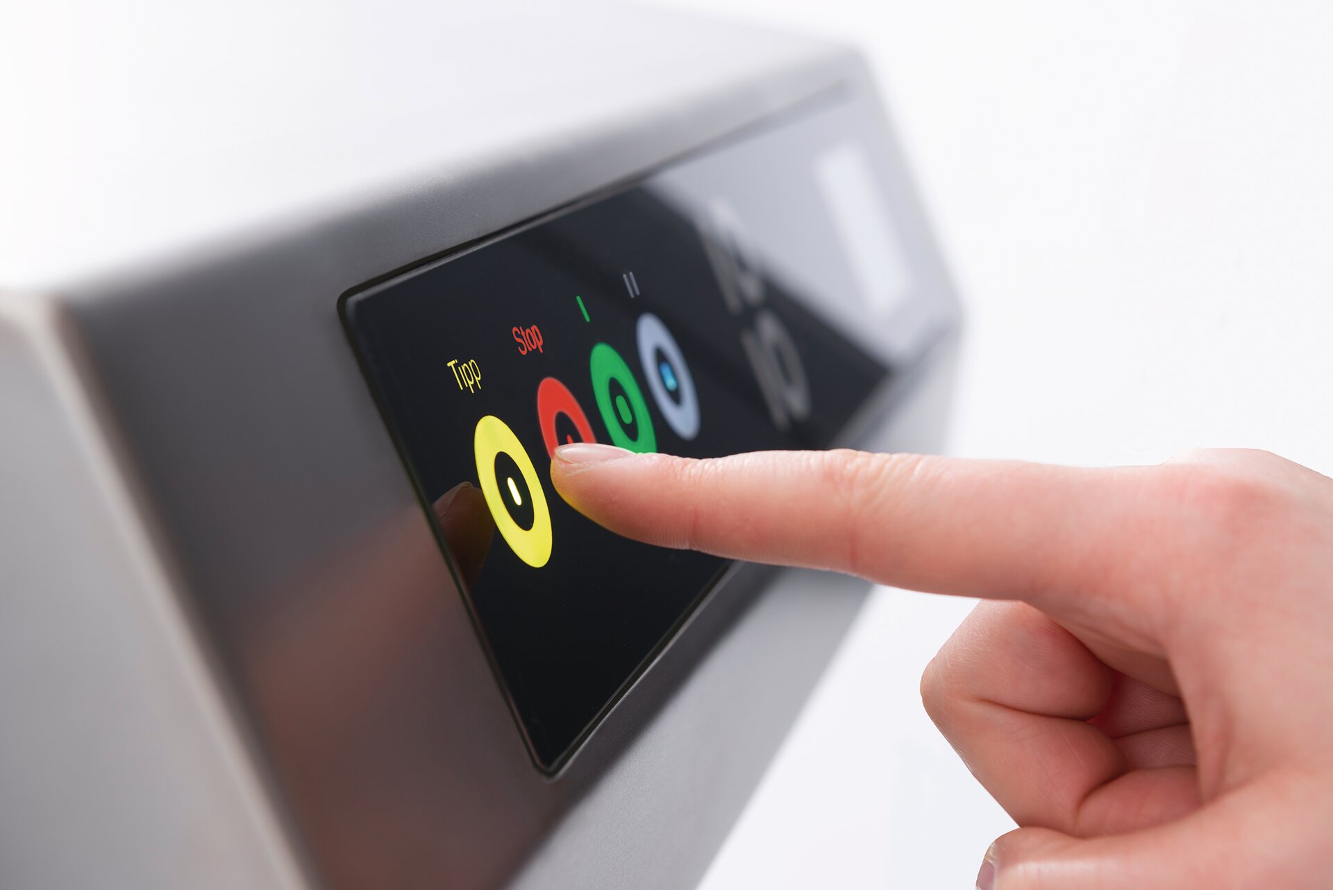 Antriebseinheit AE 30-H mit berührungsloses Touchdisplay mit farbig hinterlegten Bedienelementen, höhenverstellbares Fahrgestell, zwei Antriebsgeschwindigkeiten und Impulsstufe, Geräteerkennung für den Zusammenbau über die Symbolanzeige, Servicemeldungen wie Zeitanzeige sowie Verpolungsschutz, Anschlusswert: 1,30-1,90 kW / 400 V, Schutzart Elektrik IP 65, GS-Zeichen